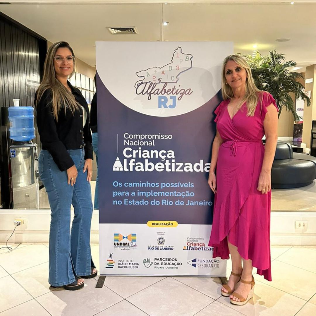 Professora Marcelle Vollu, coordenadora do programa, ao lado da secretária de Educação de Macuco, Claudia Vogas, durante o Seminário ‘Alfabetiza…