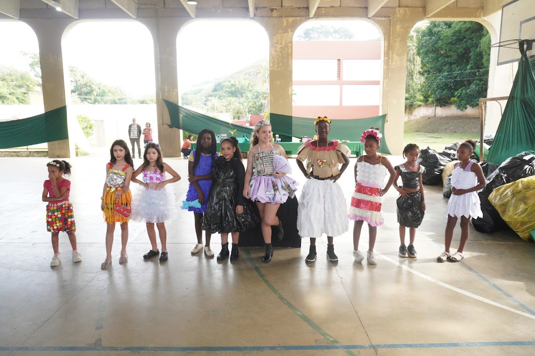 Uma fila de pequenas modelos apresentando suas criações para participar do ‘Desfile de Roupa Reciclável’, que foi um grande sucesso no evento