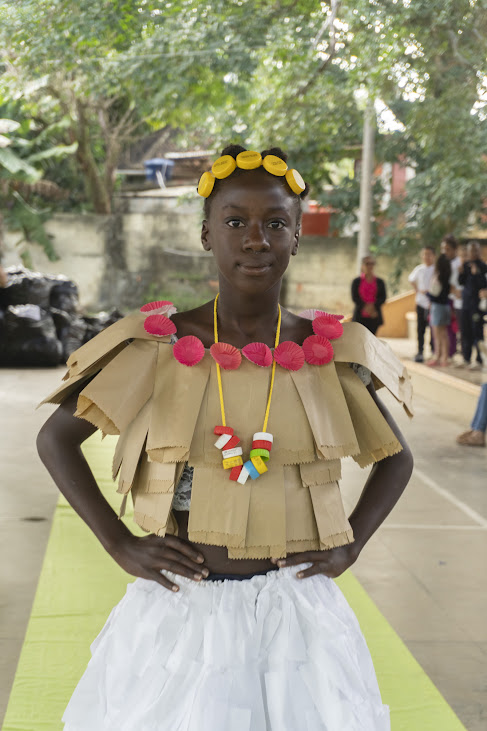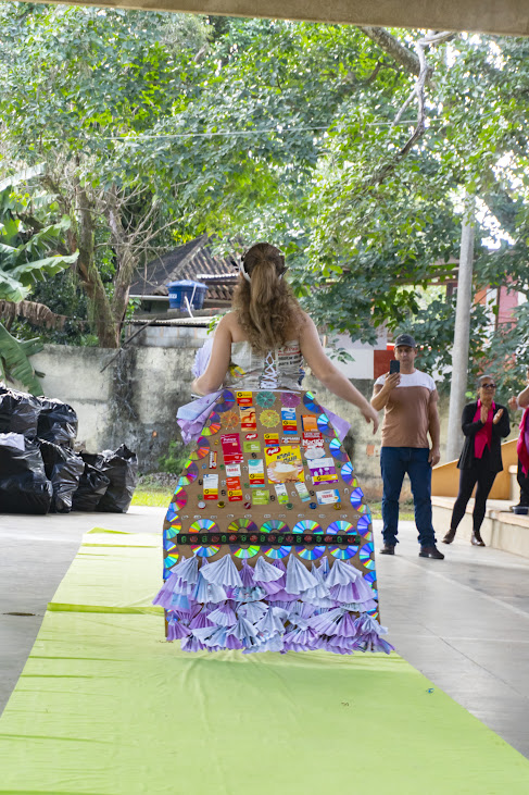A top model mirim passando pela passarela com desenvoltura e exibindo com criatividade a criação em material reciclável