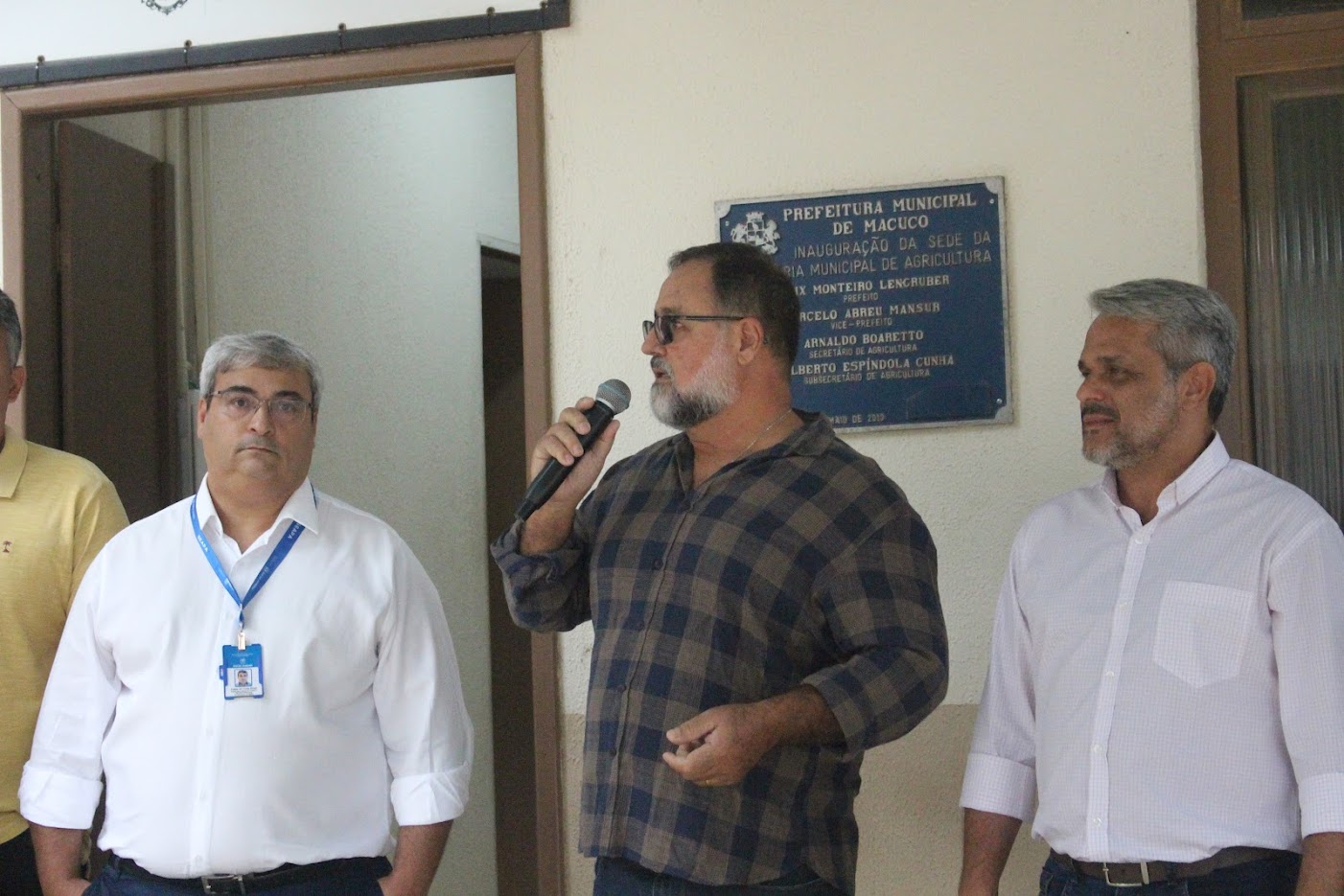 Paulo Sérgio Daflon, secretário de Agricultura de Macuco, discursa entre o subsecretário estadual Felipe Brasil e o superintendente Paulo Henrique Moraes