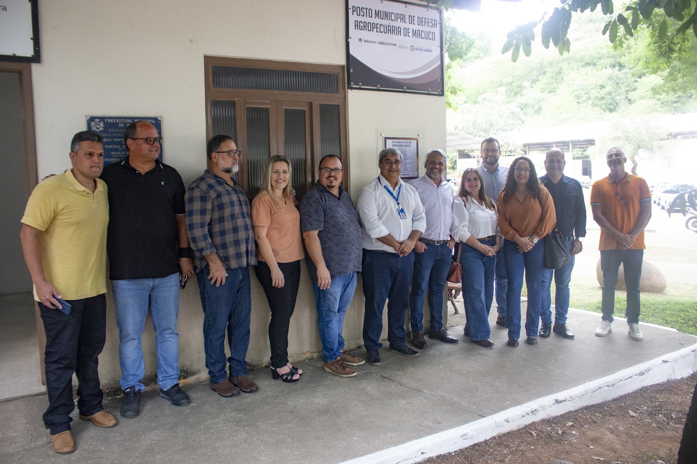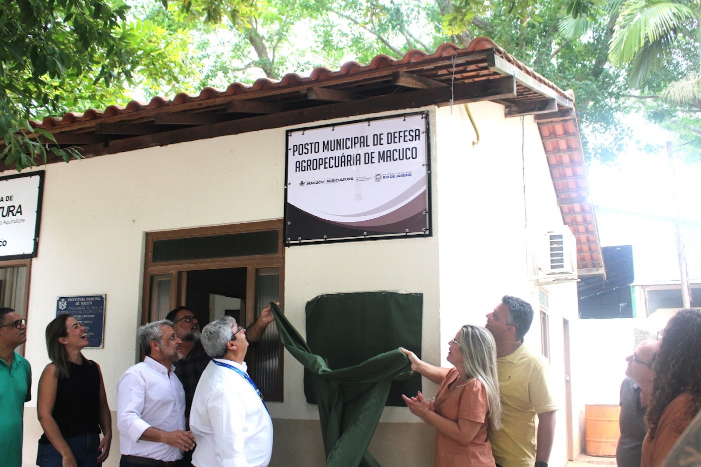 Autoridades posam diante das placas de inauguração do Posto Municipal de Defesa Agropecuária de Macuco