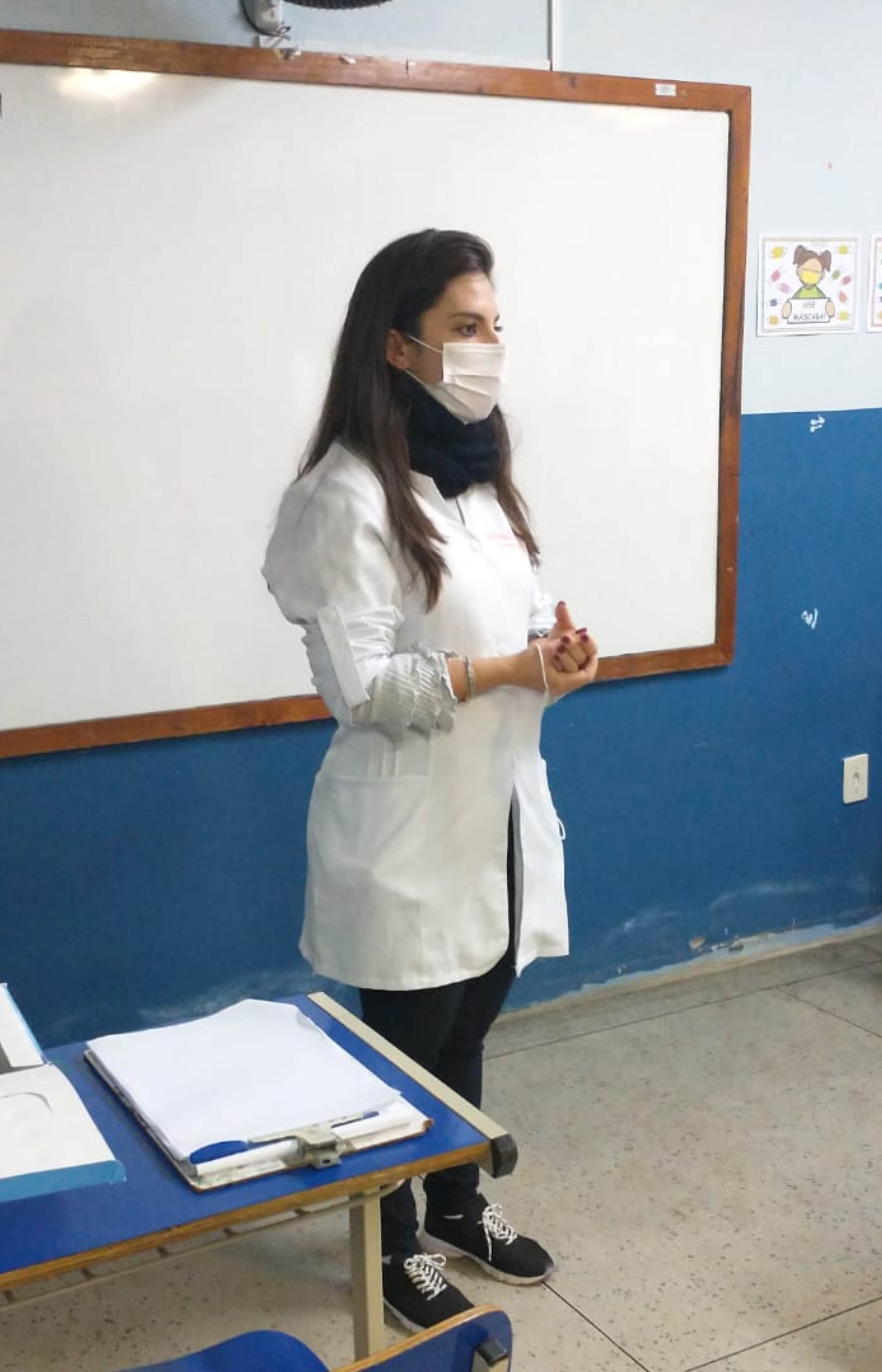 Enfermeira orienta alunos sobre como evitar o coronavírus