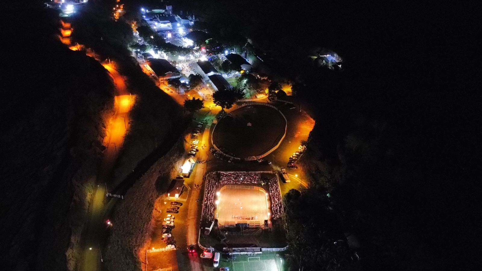 Belíssima imagem do drone mostrando a arena iluminada se destacando na paisagem noturna do Parque de Exposições Edgar Rodrigues Luterbach