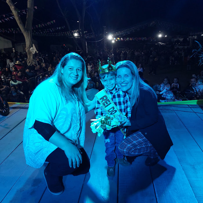 Rei do Amendoim da Escola Sylvia Bath Rosas entre a diretora Andiara Meirelles e a prefeita Michelle Bianchini