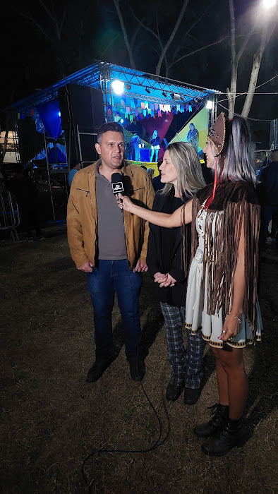 Prefeita Michelle Bianchini ao lado do secretário de Governo João Vitor no momento da entrevista para a TV Regional