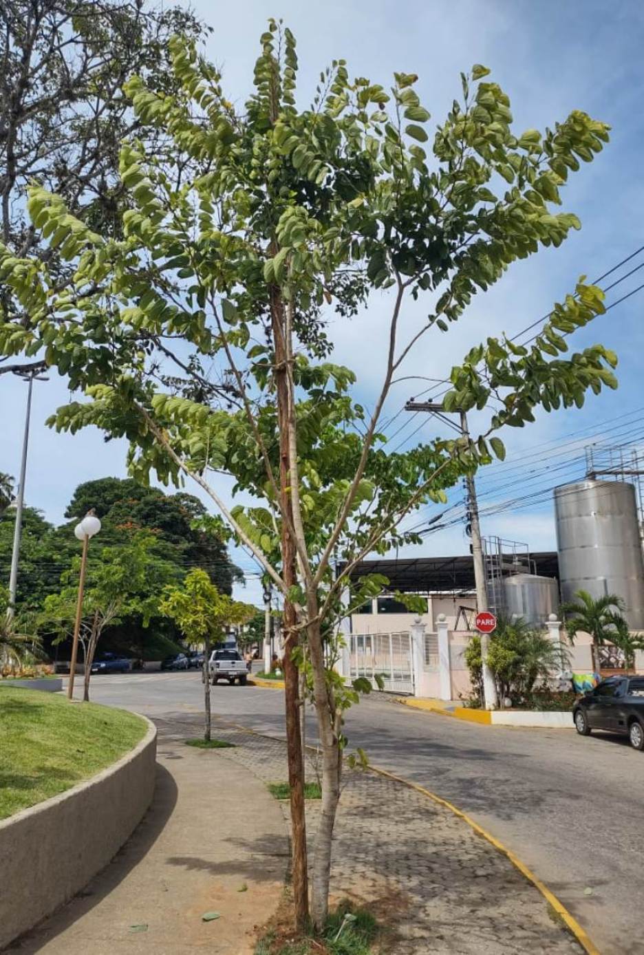 Imagem de uma árvore da espécie popularmente conhecida ‘pata de vaca’ plantada hoje já obedecendo a técnica de condutores