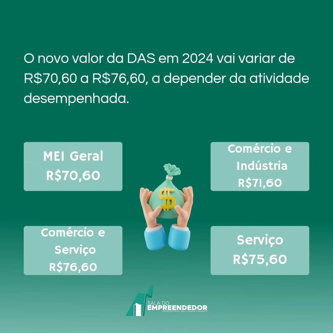 Você sabia que o DAS acompanha a variação do salário mínimo? Por isso, os novos valores começam a valer para os boletos com vencimento em 20 de fevereiro de 2024, referente à competência de janeiro. Qualquer dúvida procure Sala do Empreendedor, de segunda a sexta-feira, das 09h às 17h, para receber auxílio. Mantenha contato pelo Whatsapp (22) 99829-9254.
