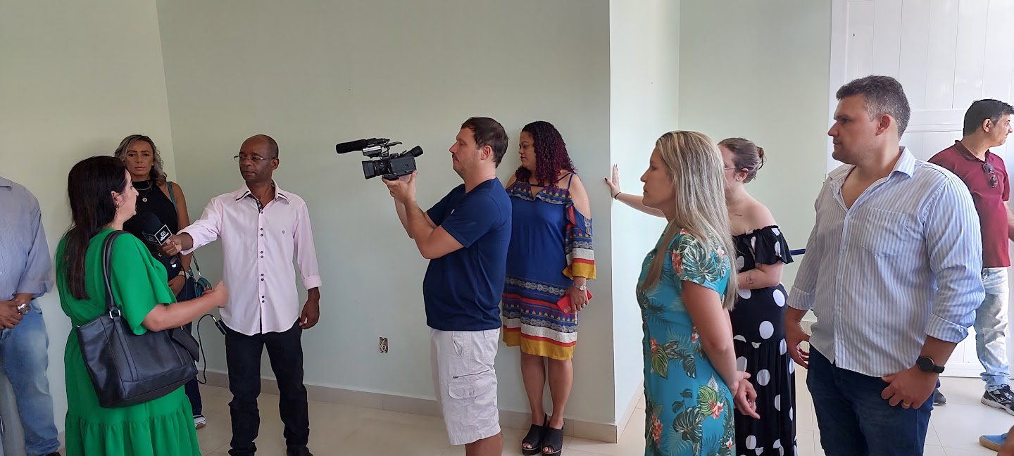 Observada pela prefeita Michelle Bianchini e pelo secretário João Vitor, secretária de Saúde Ana Paula concede entrevista a emissora de TV