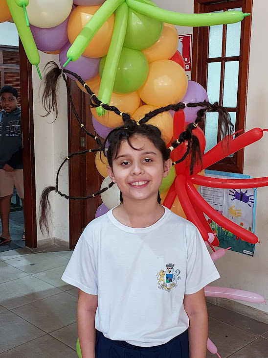 Mais uma aluna feliz exibindo o seu figurino com destaque para o cabelo bastante criativo e original cheio de borboletinhas