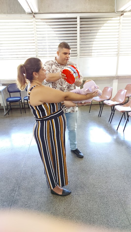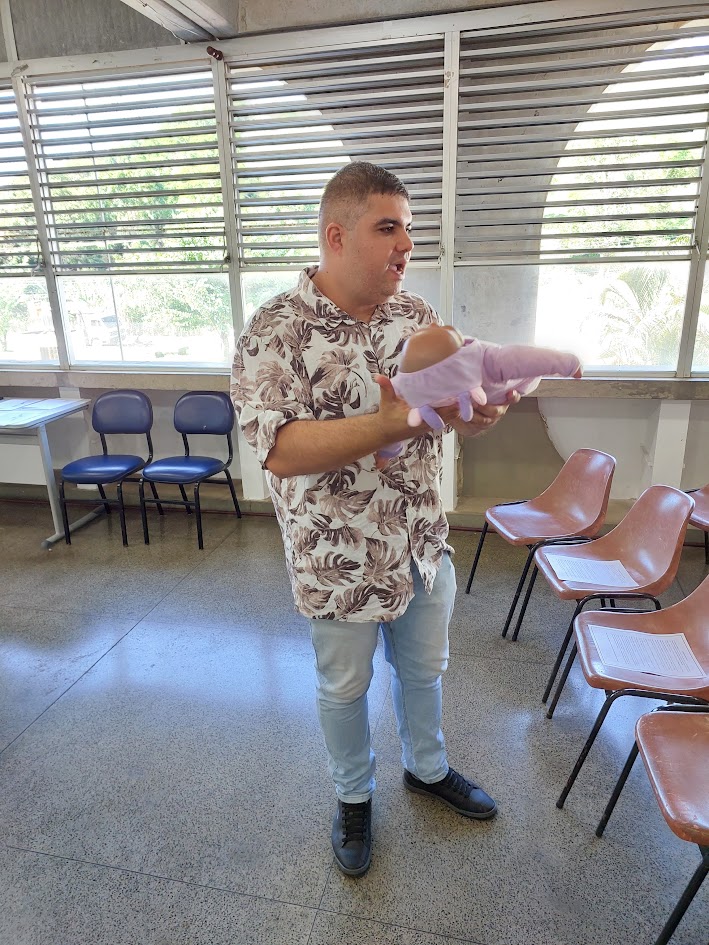 O palestrante Israel Cardoso utilizou uma boneca para mostrar como devem ser feitos na prática os estímulos com as crianças desde muito cedo