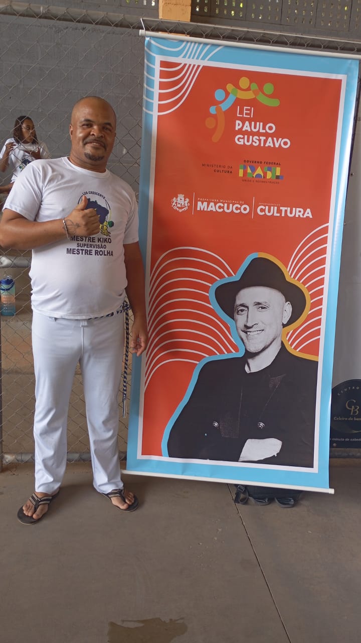 Um dos integrantes da Elite de Bimba posa ao lado do cartaz alusivo ao incentivo proporcionado através da Lei Paulo Gustavo