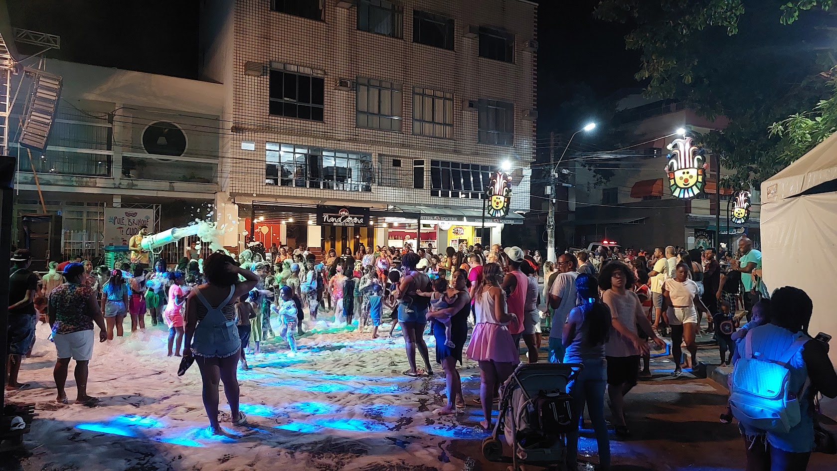 A imagem mostra um momento de integração entre a plateia, formada pela criançada durante o Banho de Espuma, e a Banda Pena de Ouro