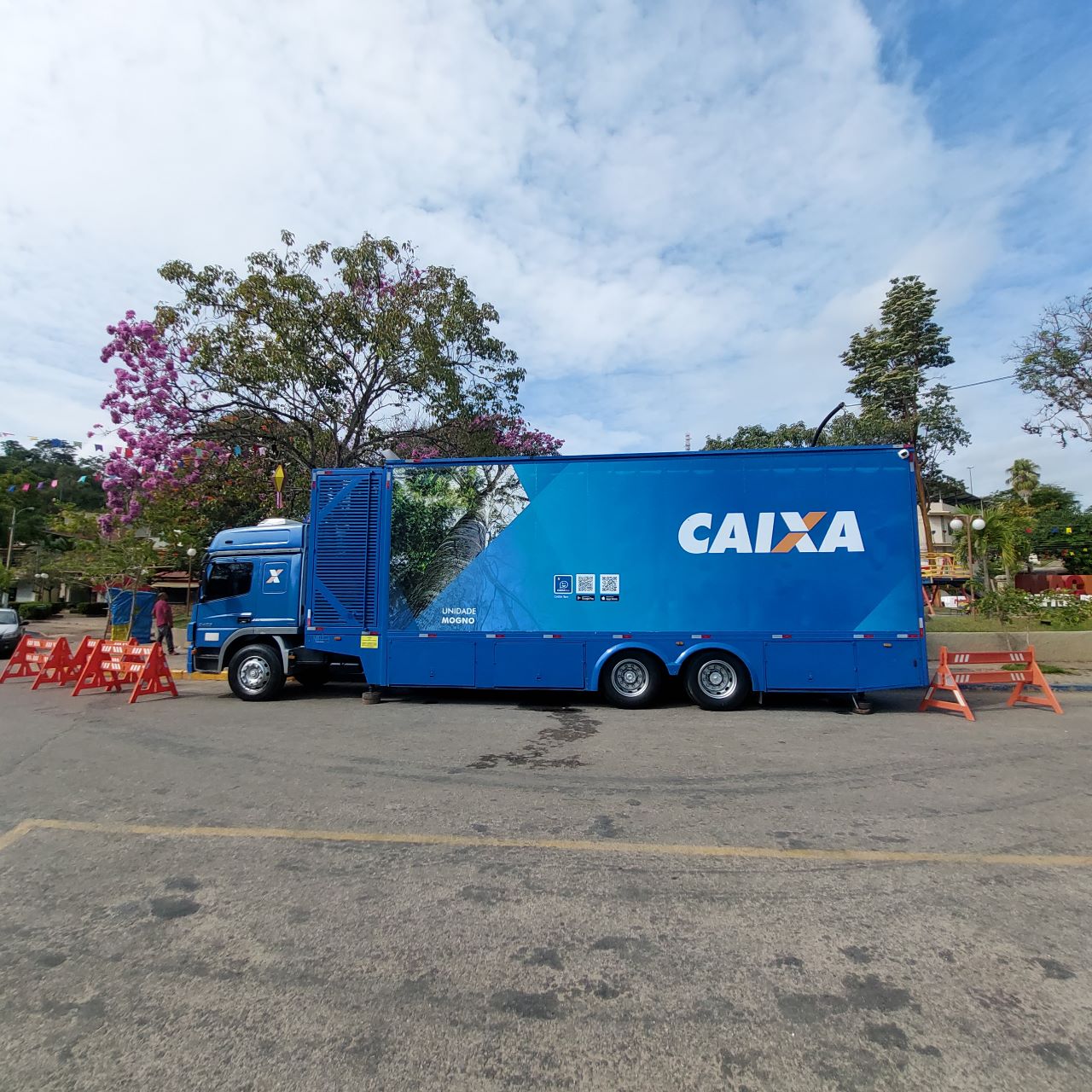 A Carreta Agro da Caixa Econômica Federal está estacionada nas proximidades do coreto da praça, em frente à Loja da Cooperativa de Macuco