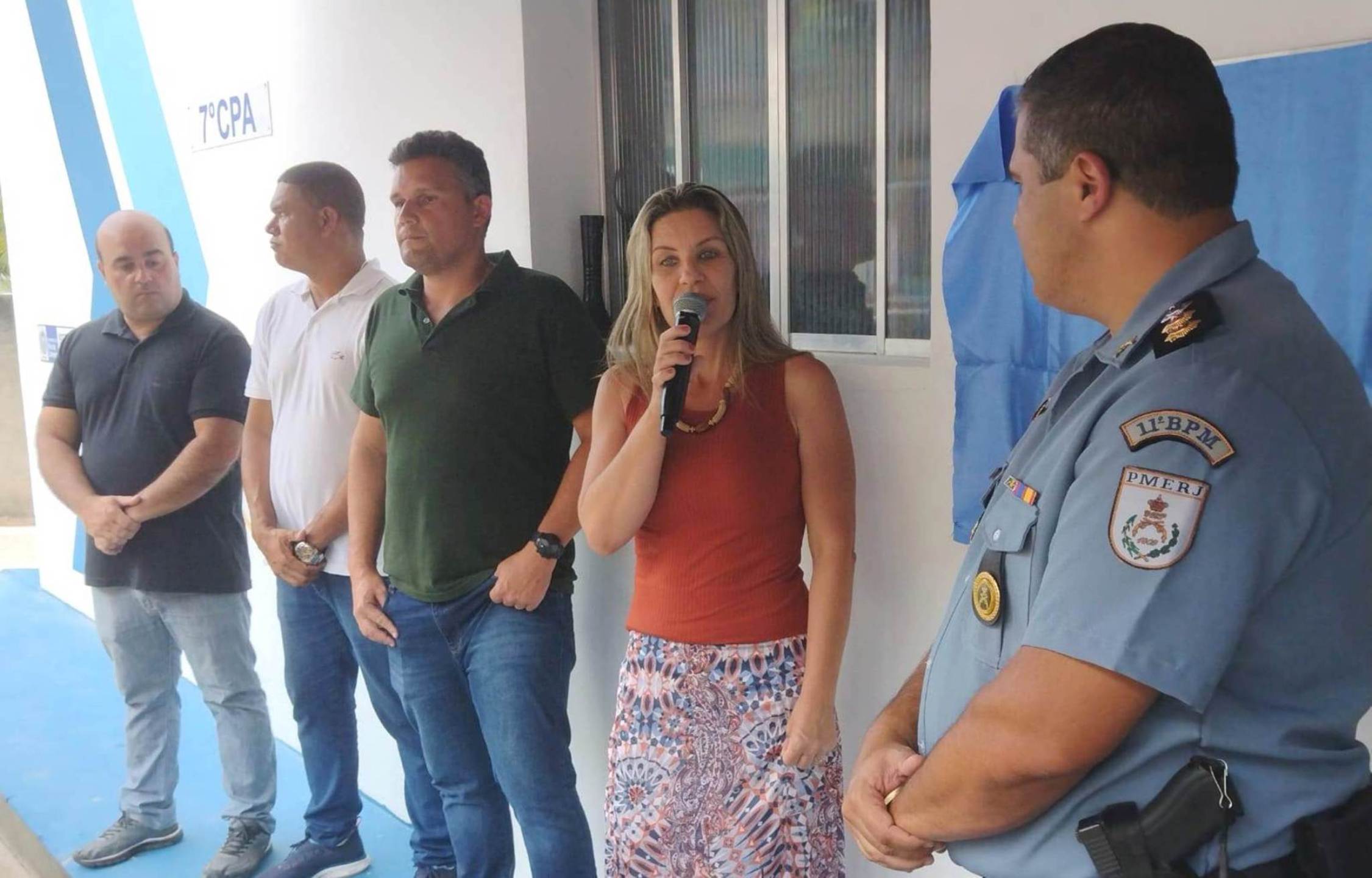 Michelle Bianchini discursa entre o esposo e secretário de Governo João Vitor, vereadores Felipe Carvalho e Alberto Herdy e Tenente Coronel Holanda