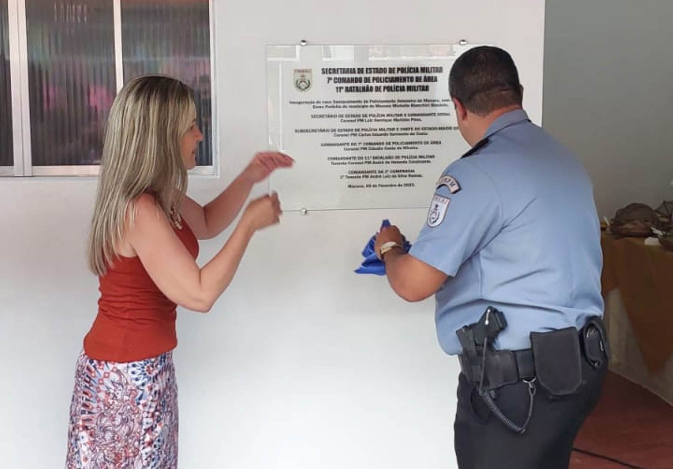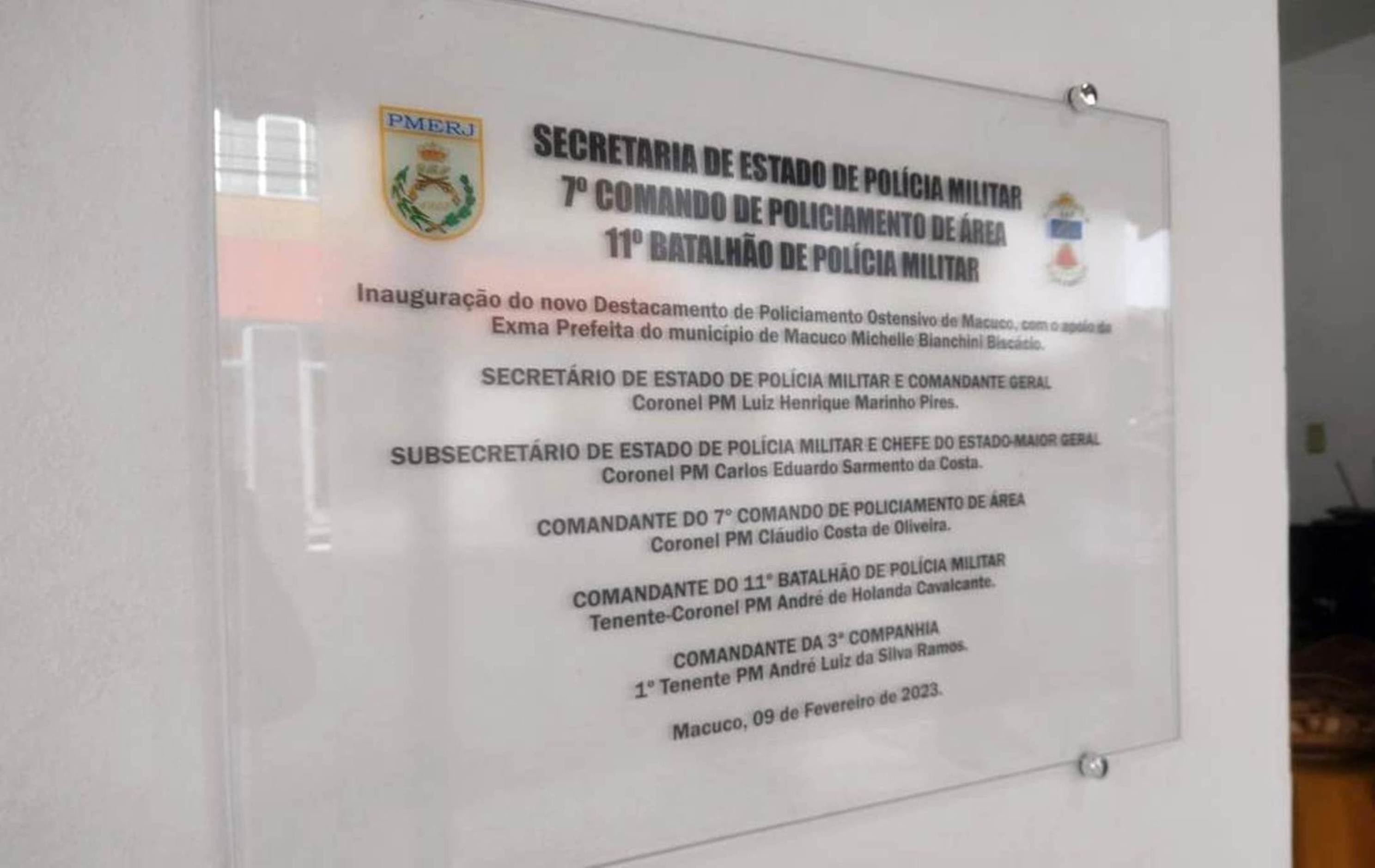 Placa contendo as informações sobre o comando da Polícia Militar exposta na entrada do novo DPO de Macuco