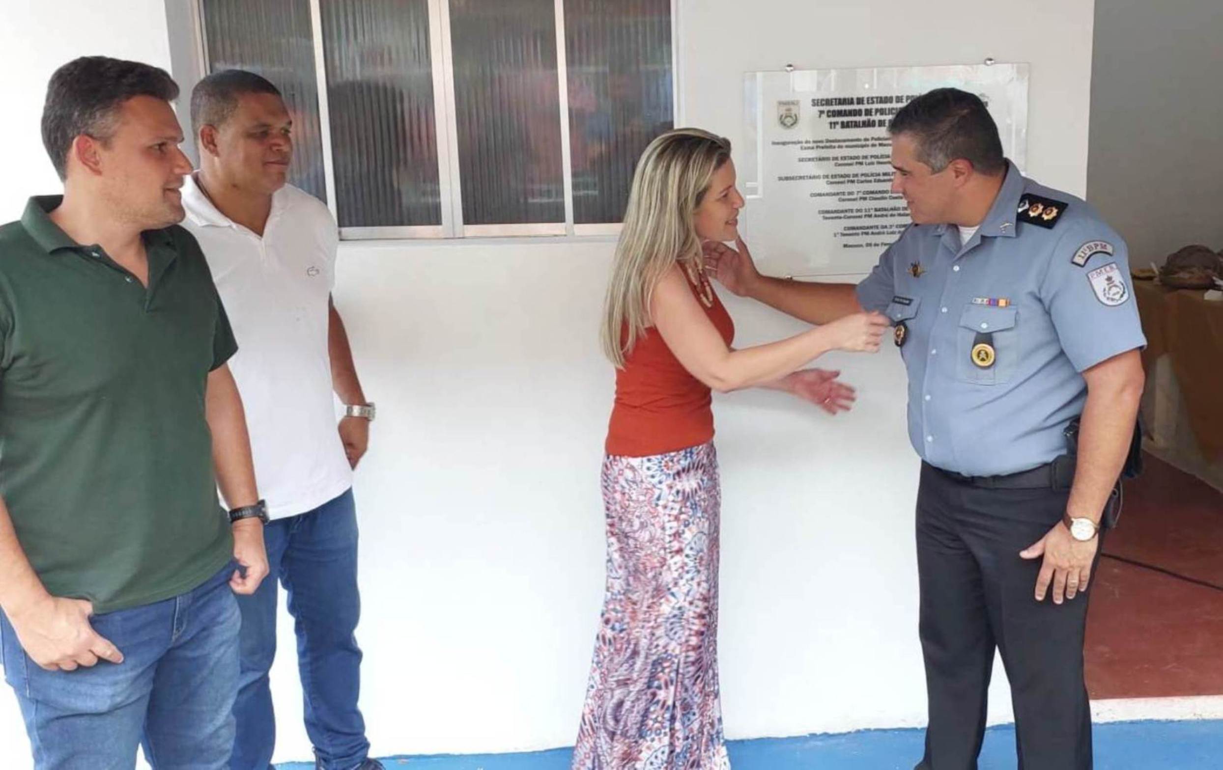 Prefeita Michelle Bianchini e o comandante do 11º BPM de Nova Friburgo Tenente Coronel Holanda descerrando a faixa inaugural do DPO de Macuco