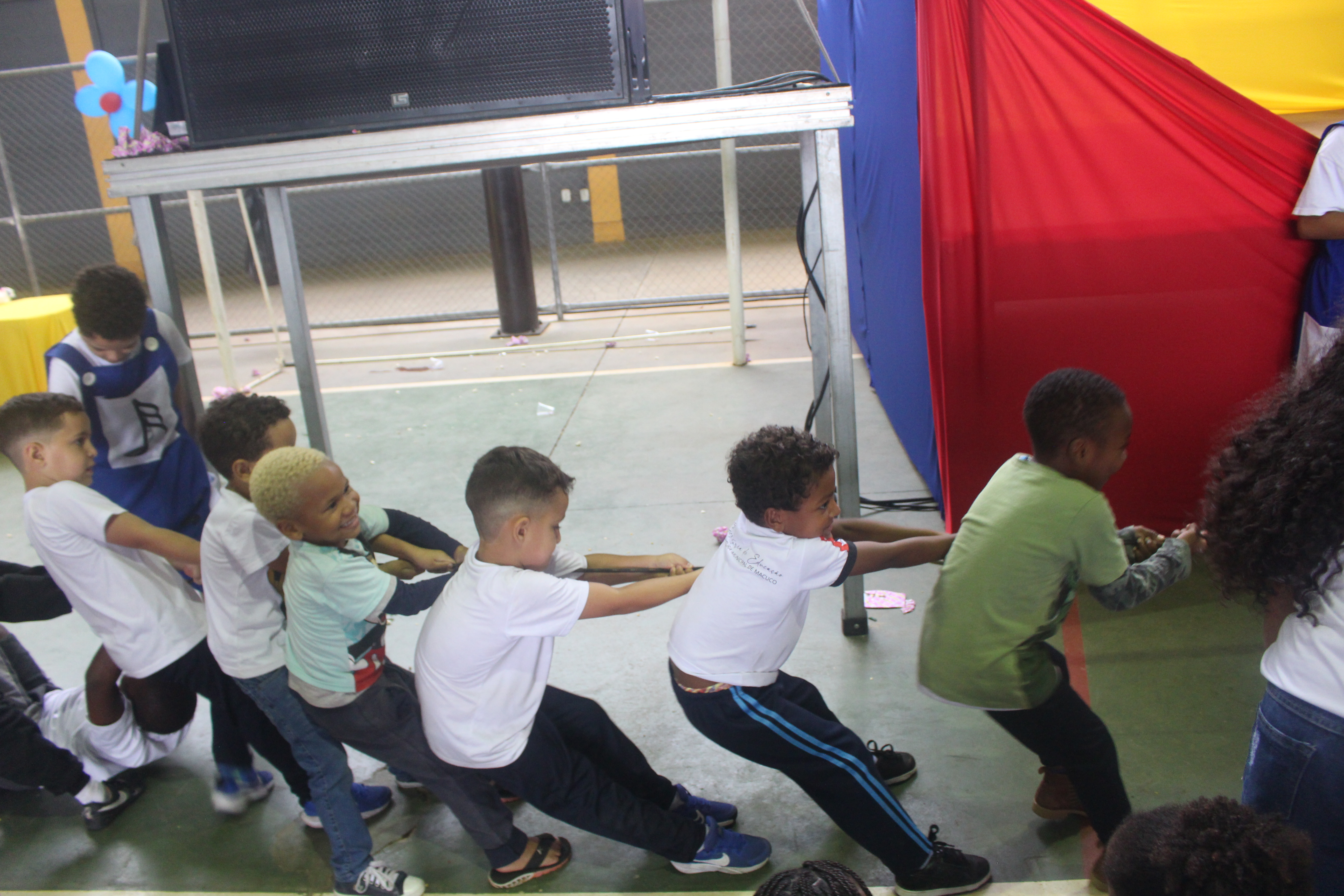 Exibindo força e vontade de vencer, os meninos se esforçaram no cabo de guerra, outra brincadeira que movimentou o evento