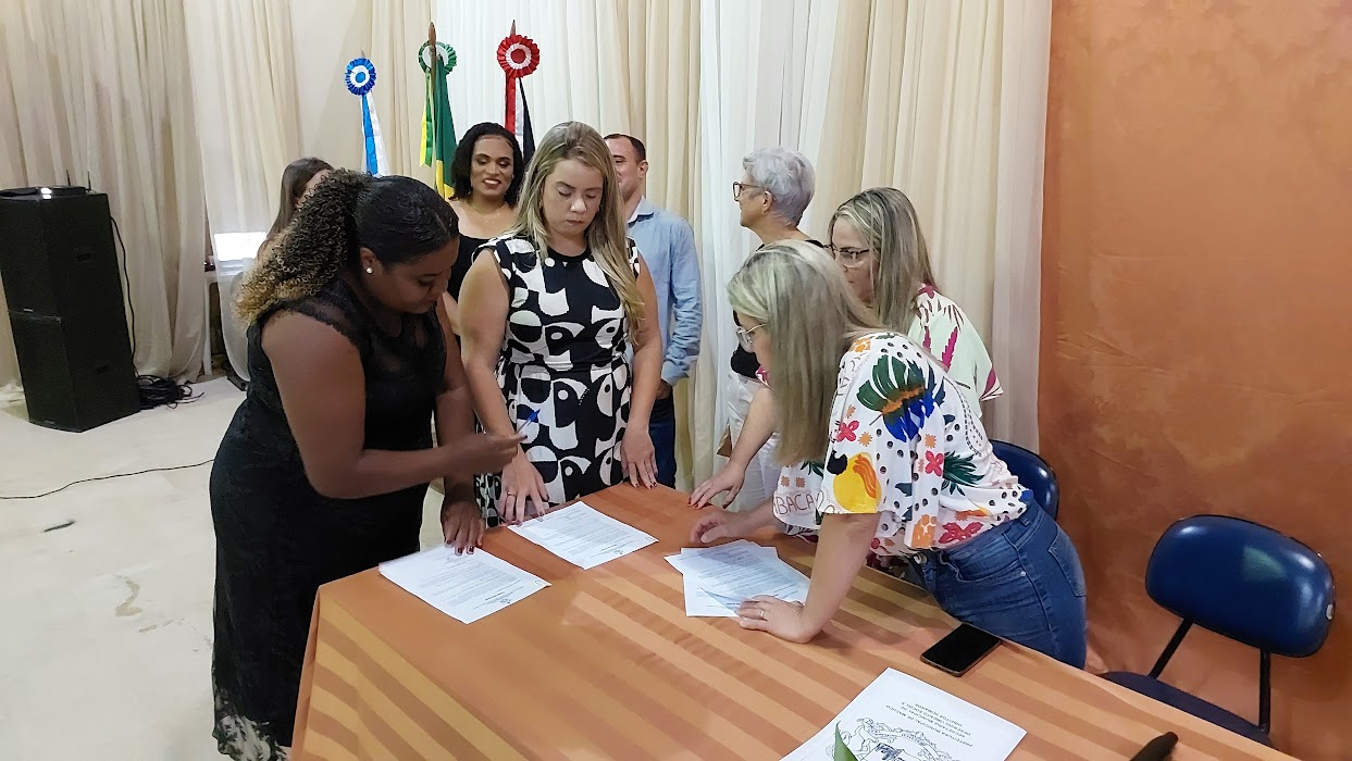 Juntamente com a prefeita Michelle Bianchini, duas das novas conselheiras assinam o termo de posse durante a solenidade