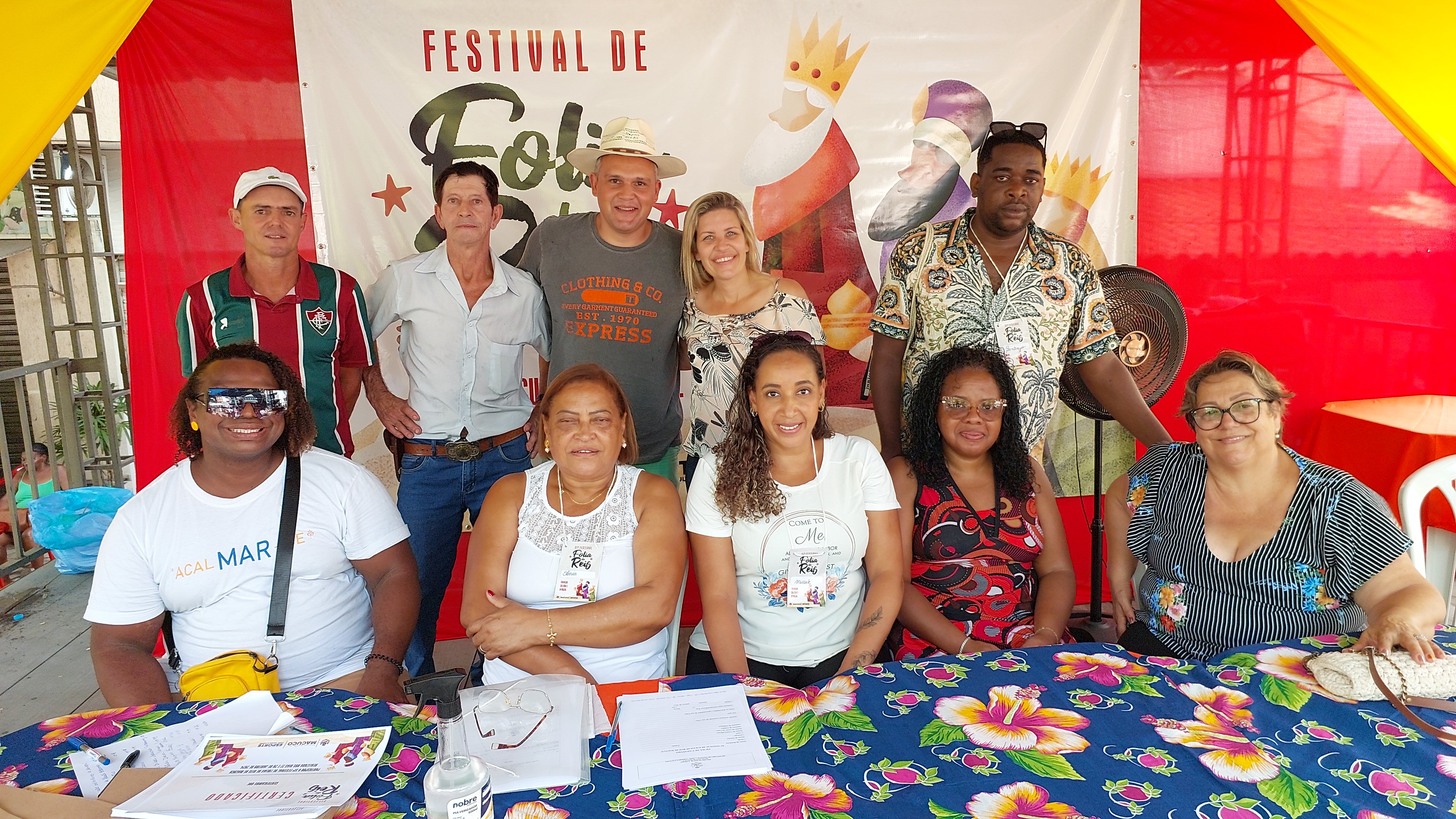 Equipe de organização do Festival de Folias de Reis e autoridades durante o evento no domingo