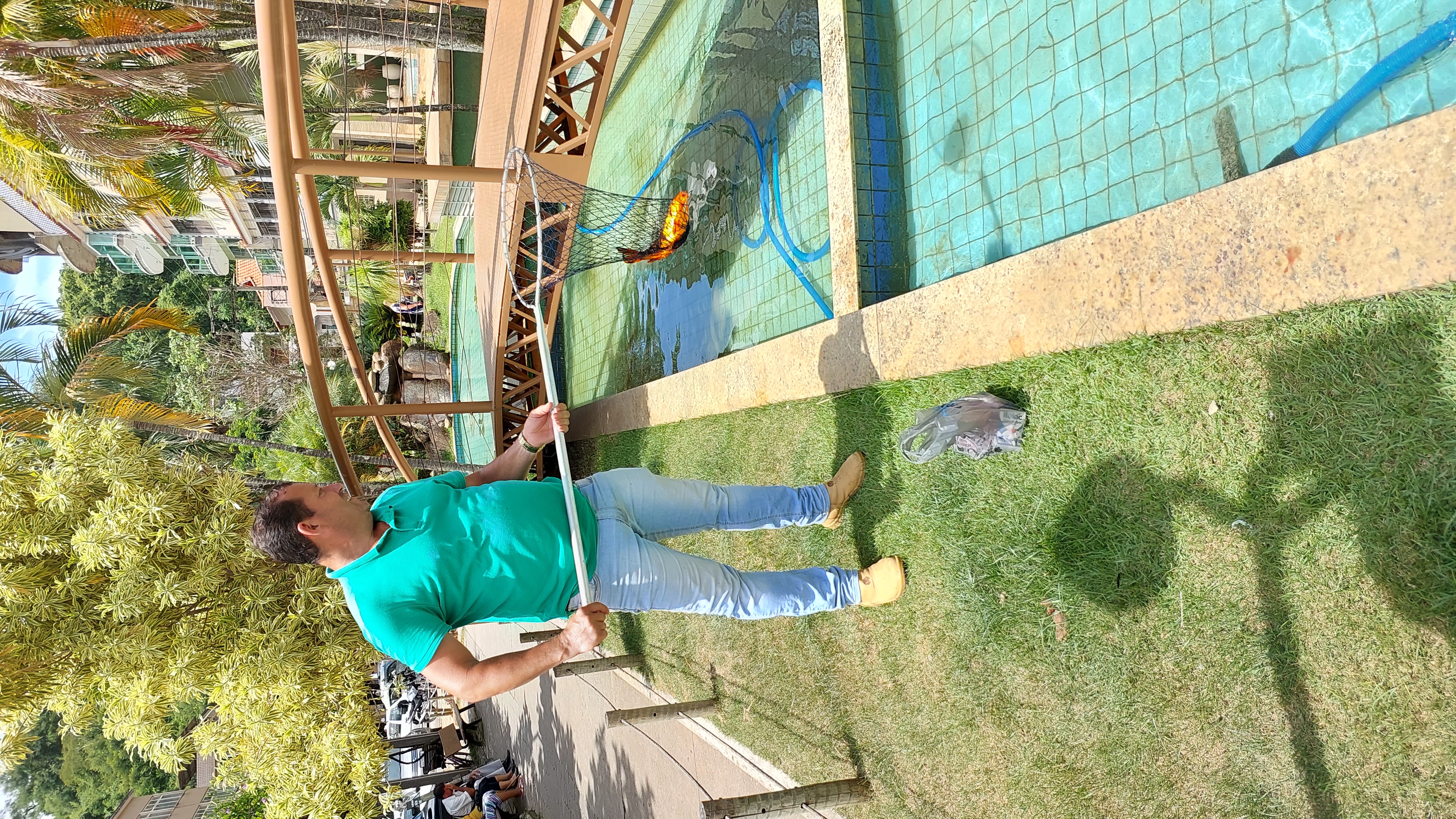 Secretário Marquinhos da Obra capturando os peixes para transferi-los para o outro espelho d’água
