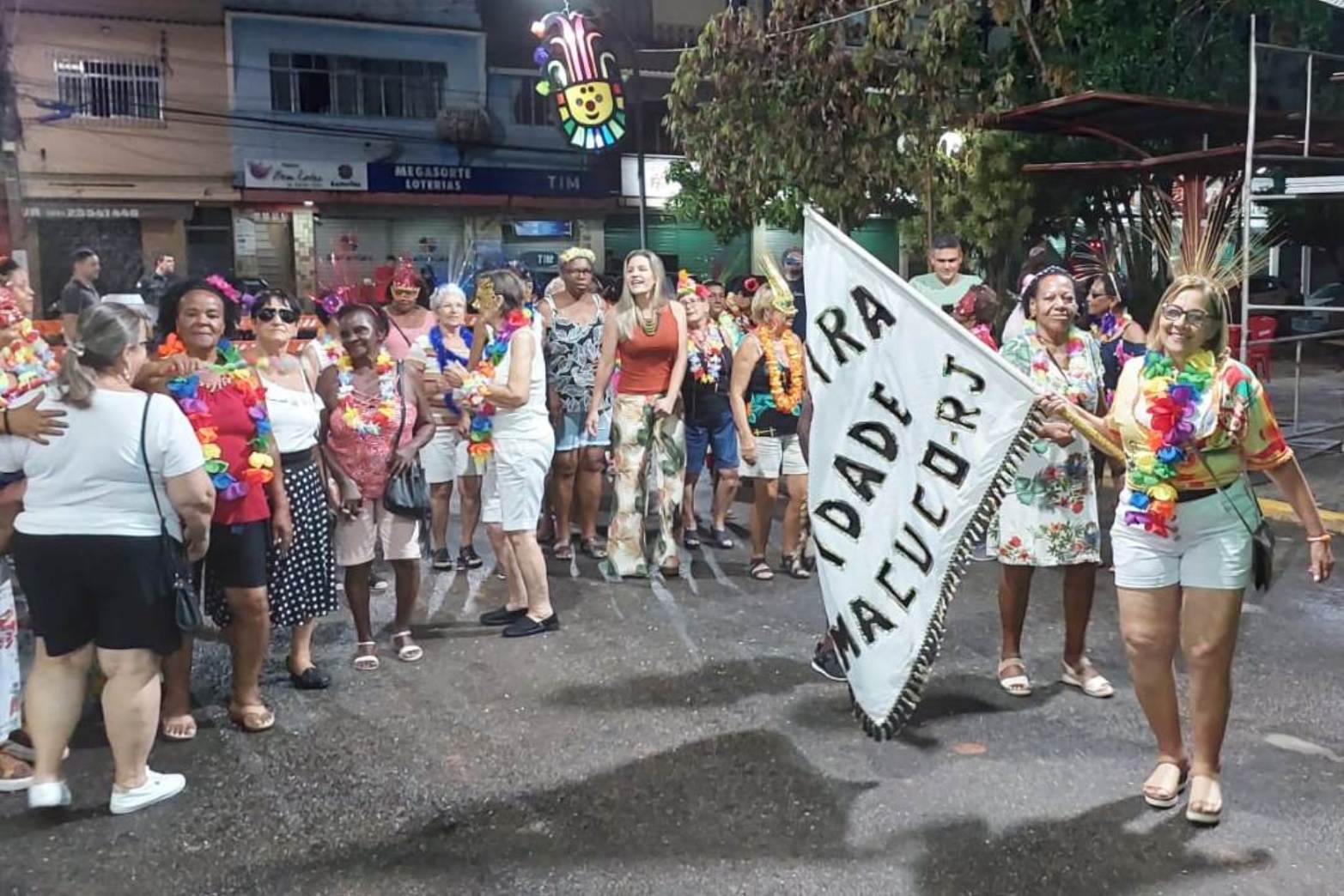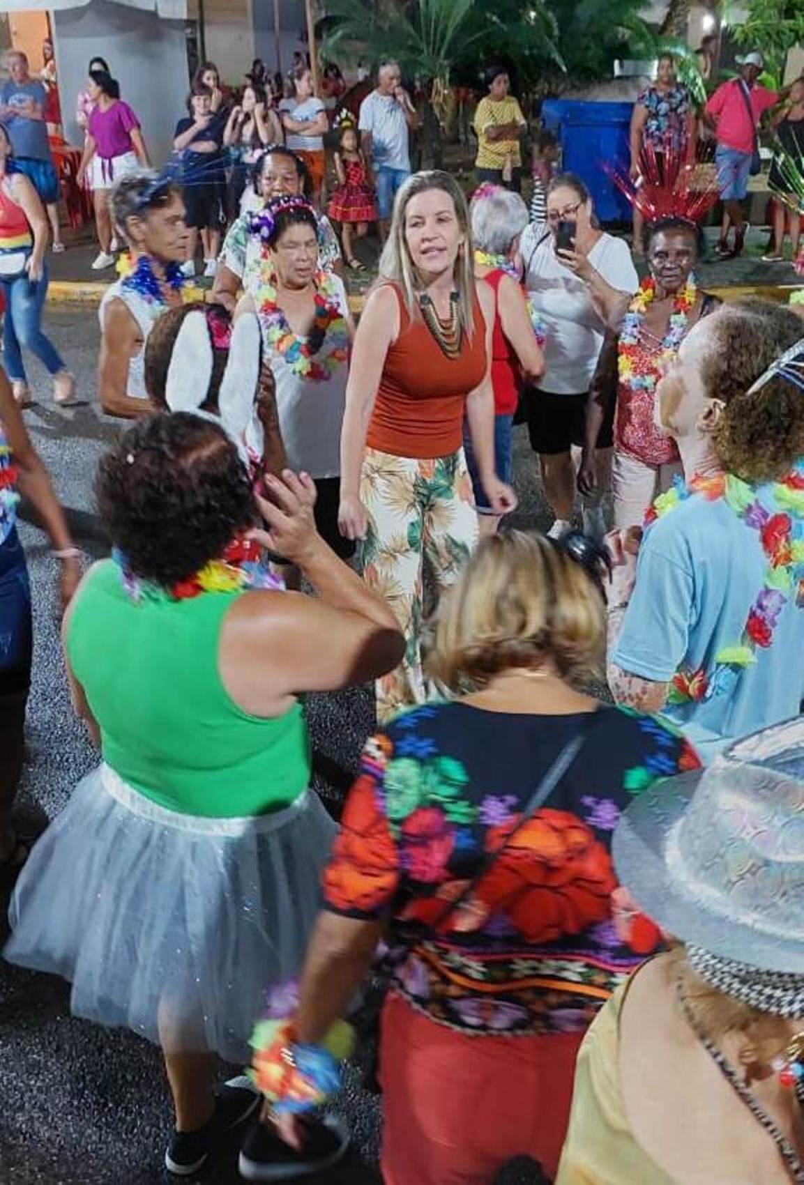Michelle Bianchini ficou muito à vontade e feliz em meio às integrantes do Bloco da Melhor Idade de Macuco