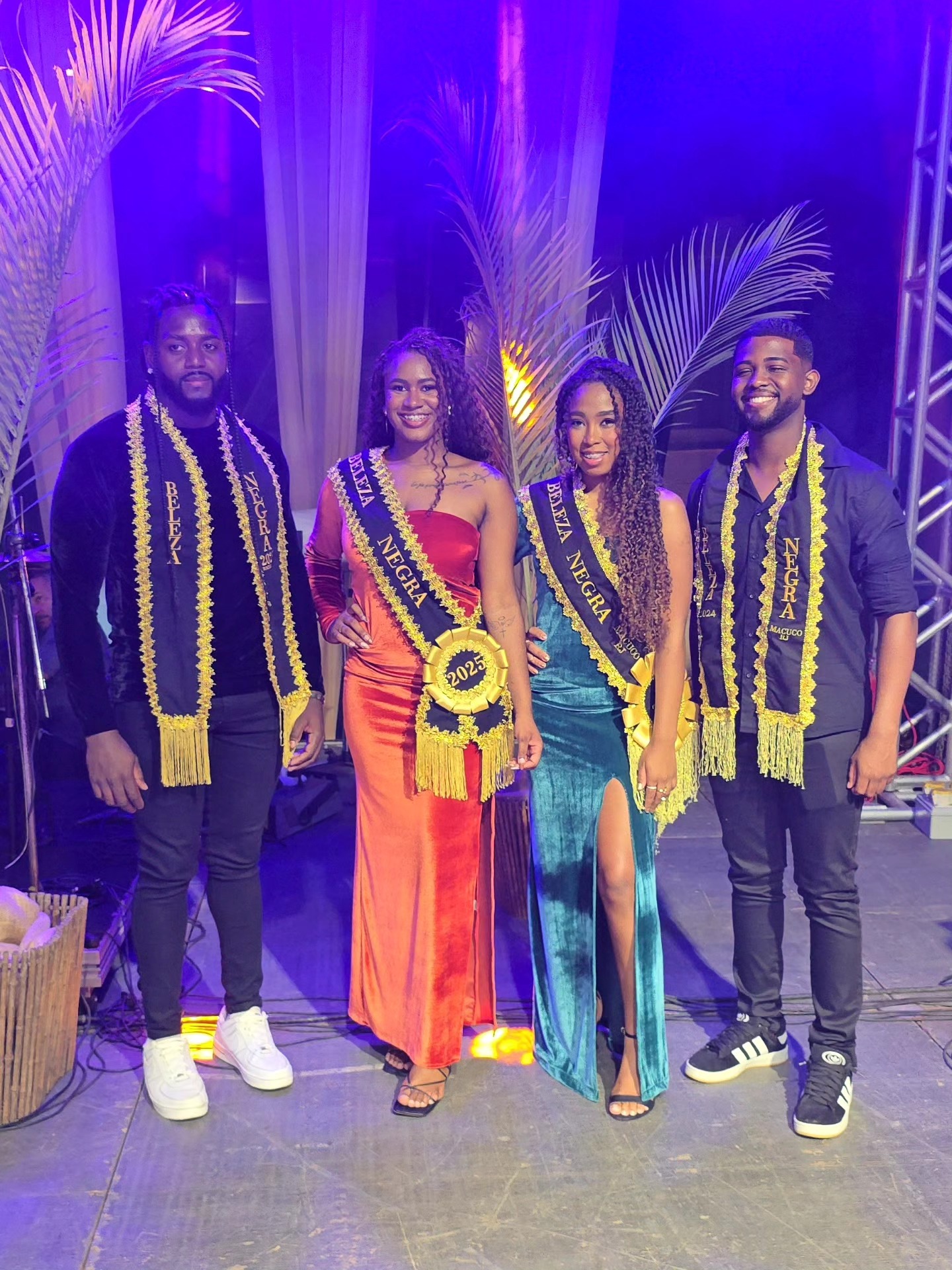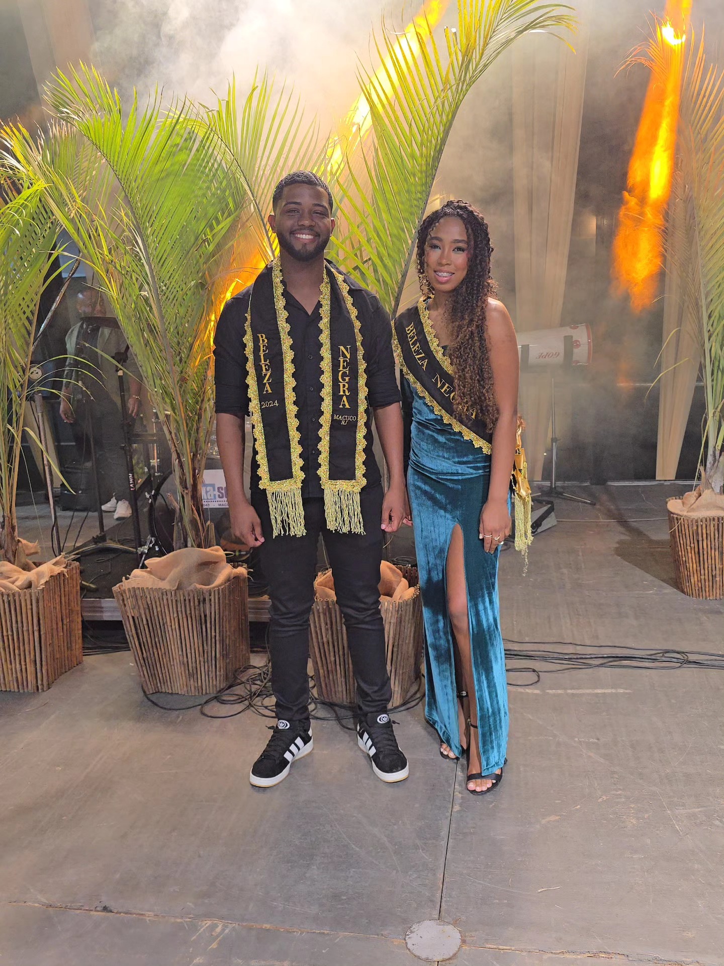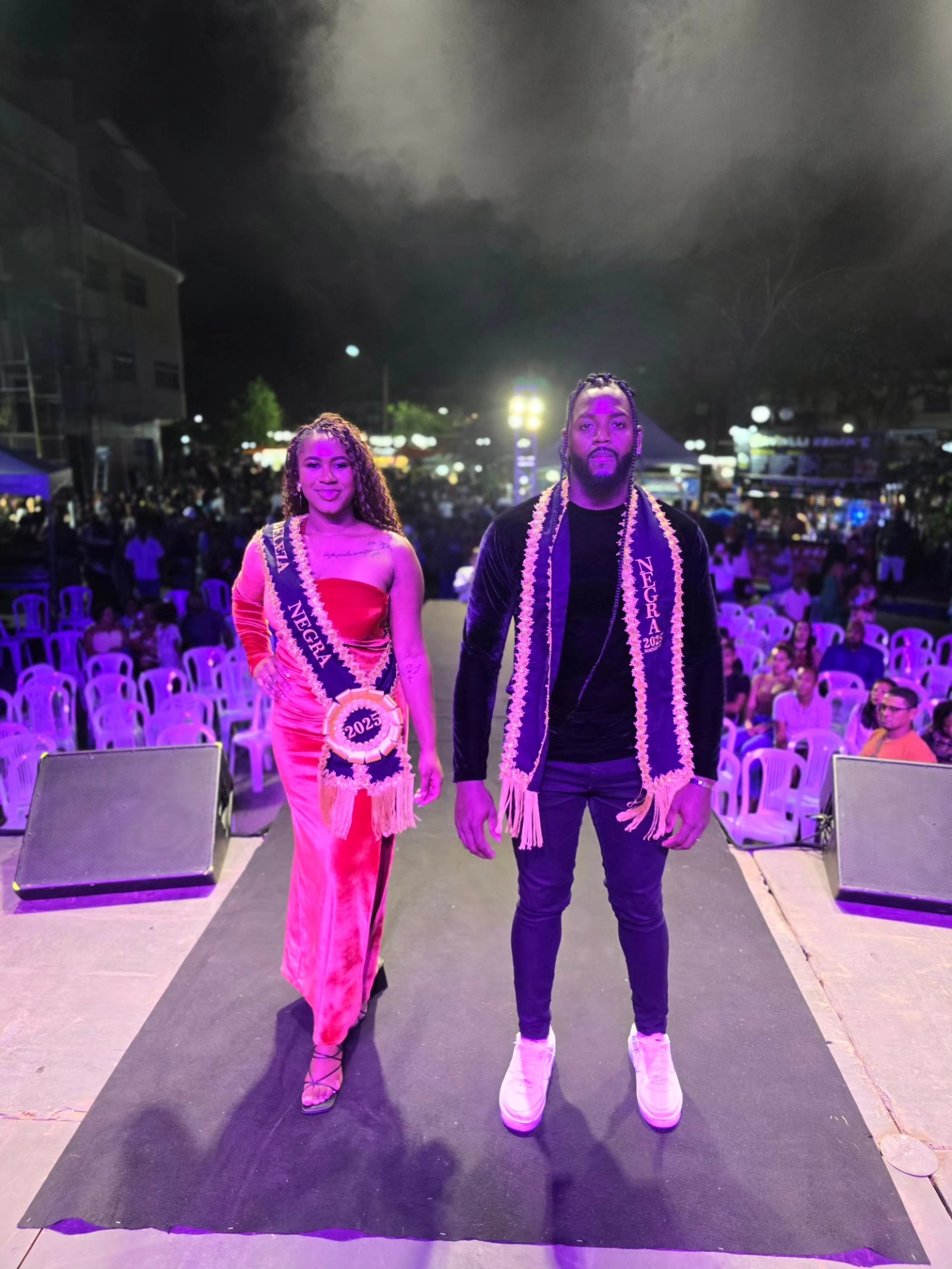 Já com suas faixas exibindo a vitória como Rainha e Rei da Beleza Negra de Macuco em 2025, Sara Cristina e Natalino posam na frente do palco e diante do público