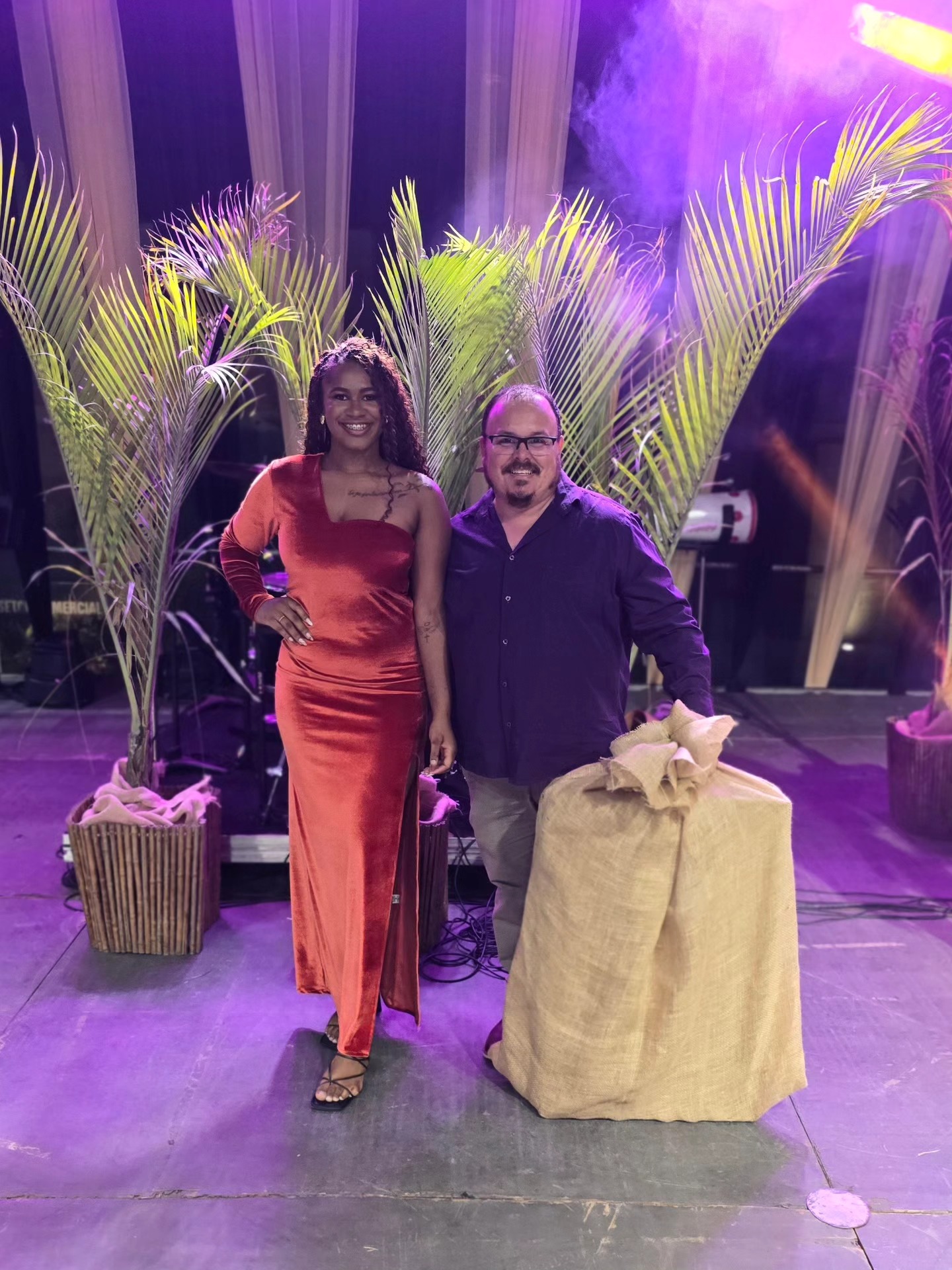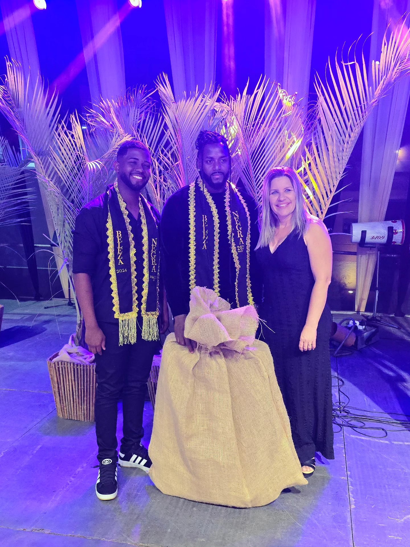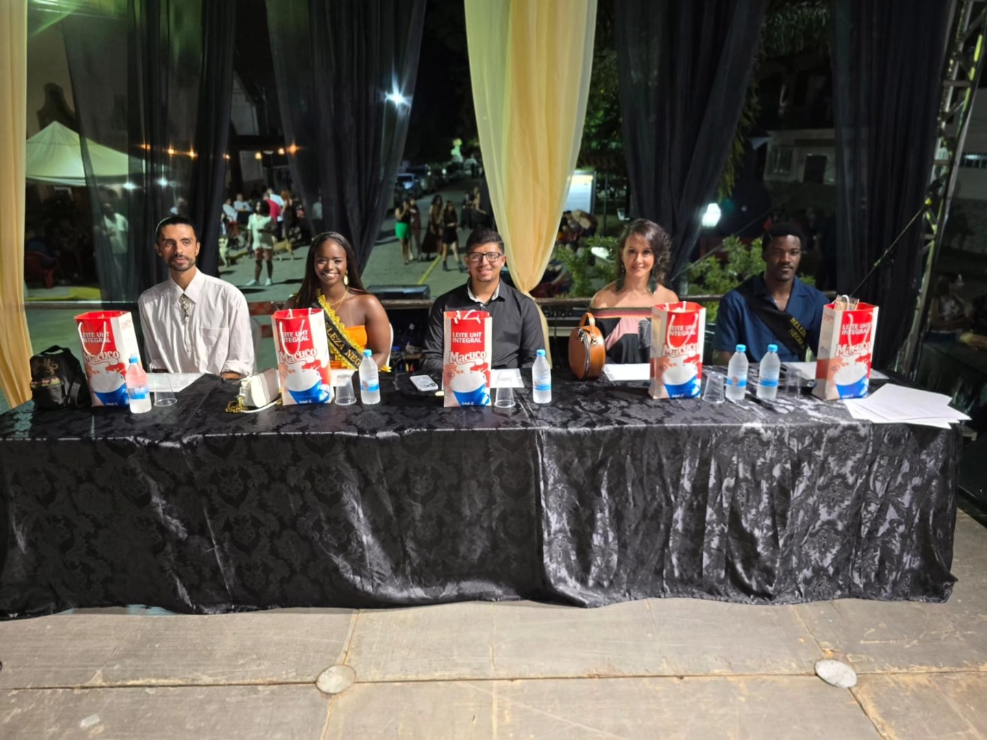 Já com suas faixas exibindo a vitória como Rainha e Rei da Beleza Negra de Macuco em 2025, Sara Cristina e Natalino posam na frente do palco e diante do público