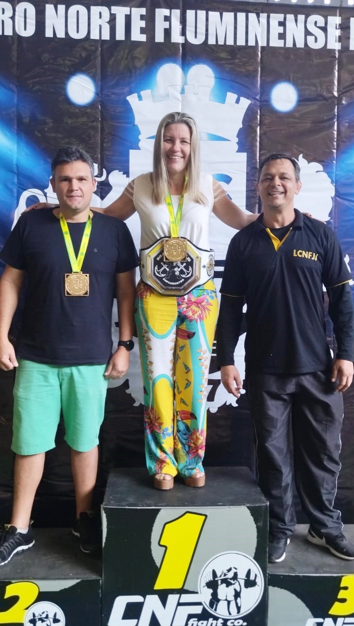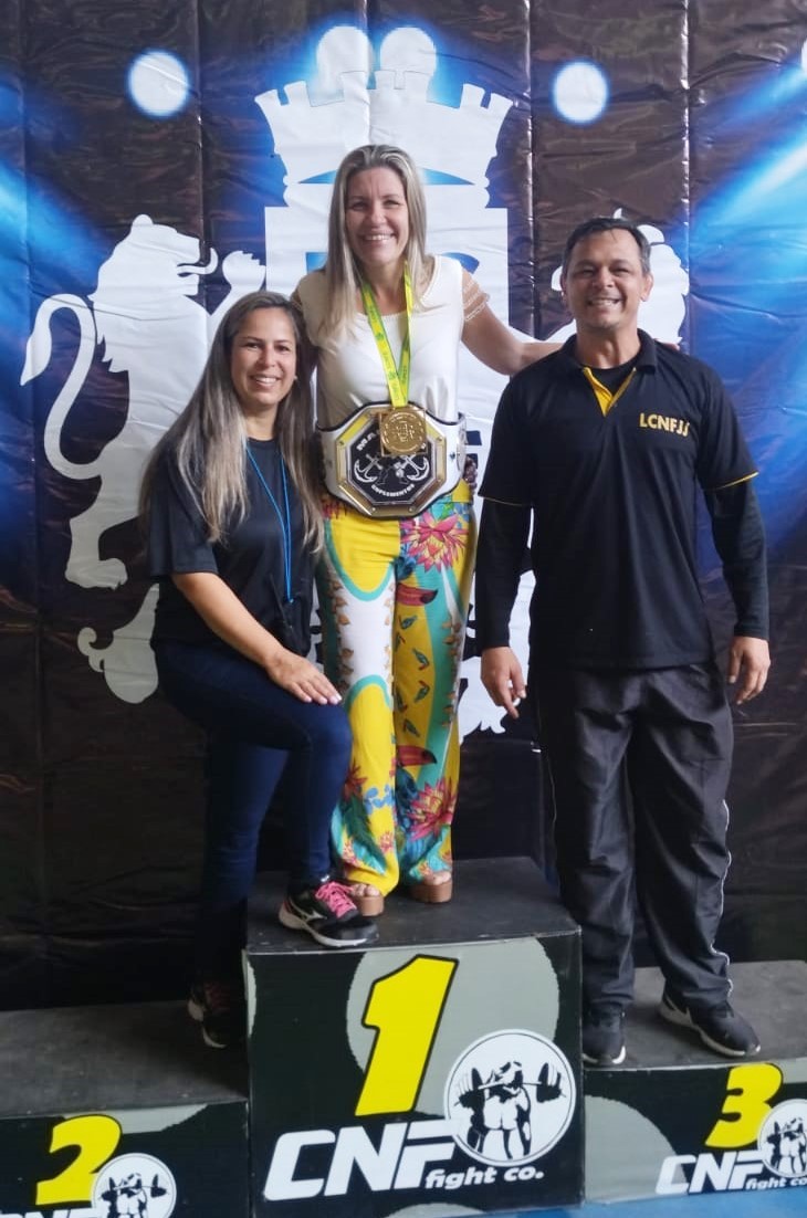 Prefeita dividindo o pódio com o presidente da LCNFJJ e sua esposa durante a Copa de Jiu-Jitsu de Macuco