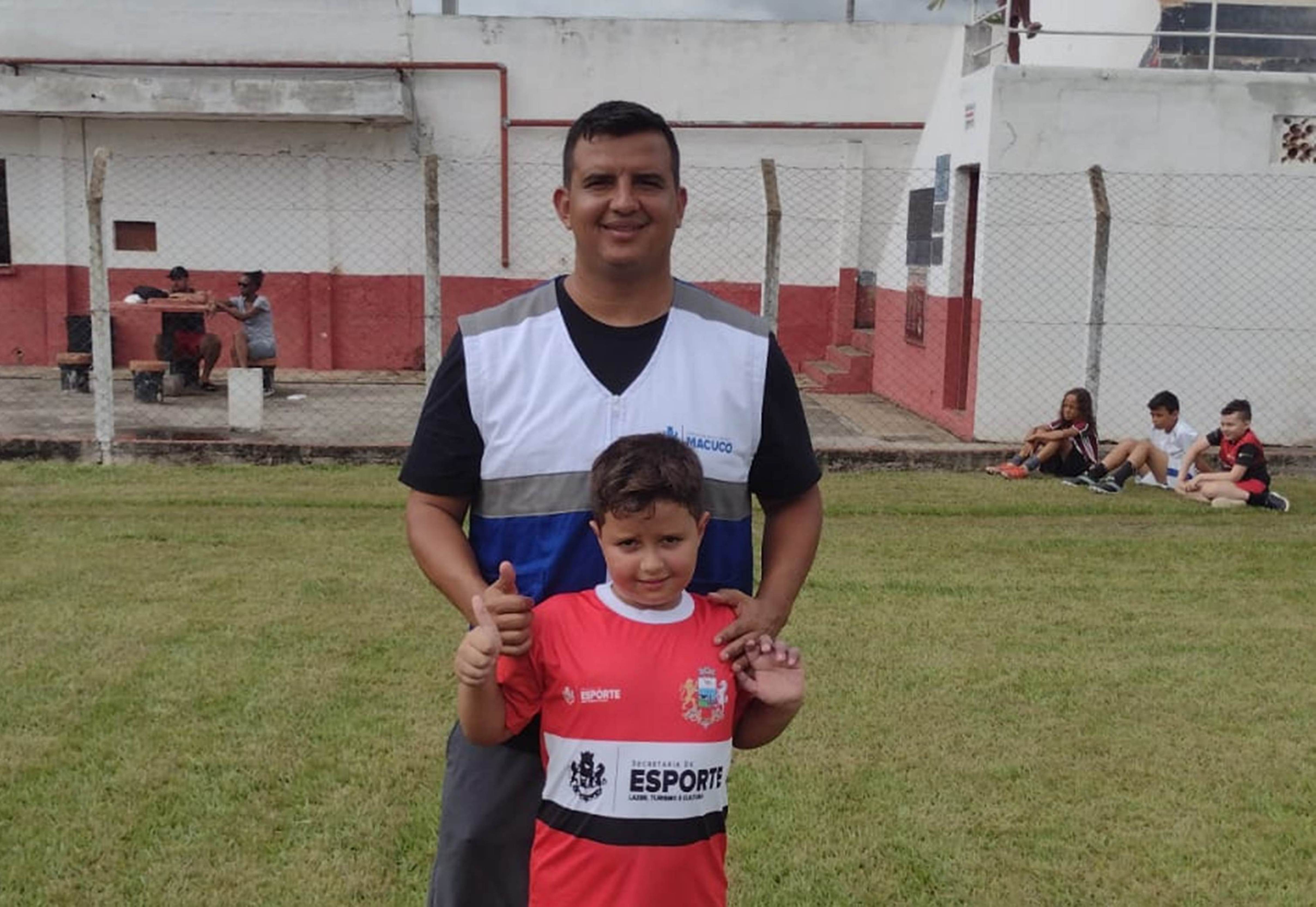 Secretário Huguinho com um dos muitos meninos que frequentam as aulas do projeto ‘Macuco Bom de Bola’