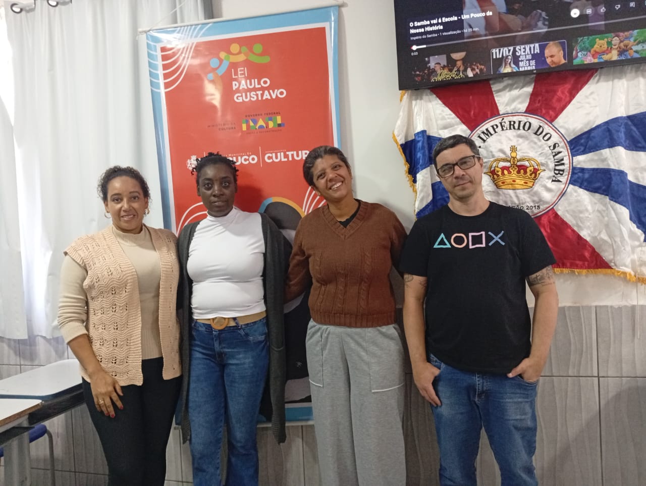 Diretora Micaelle Mattos ao lado de representantes do projeto do Grêmio Recreativo Escola de Samba Império do Samba no Colégio Rodolfo Albino