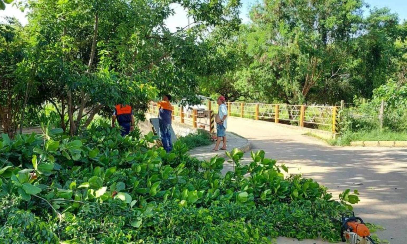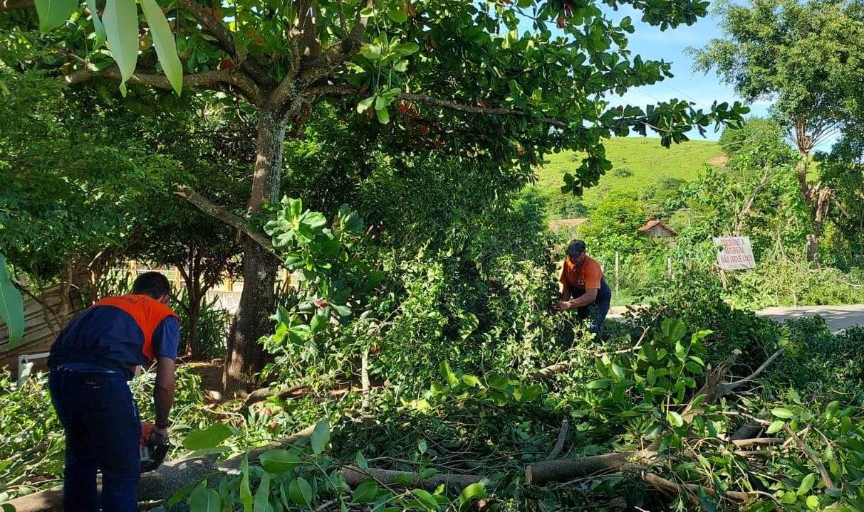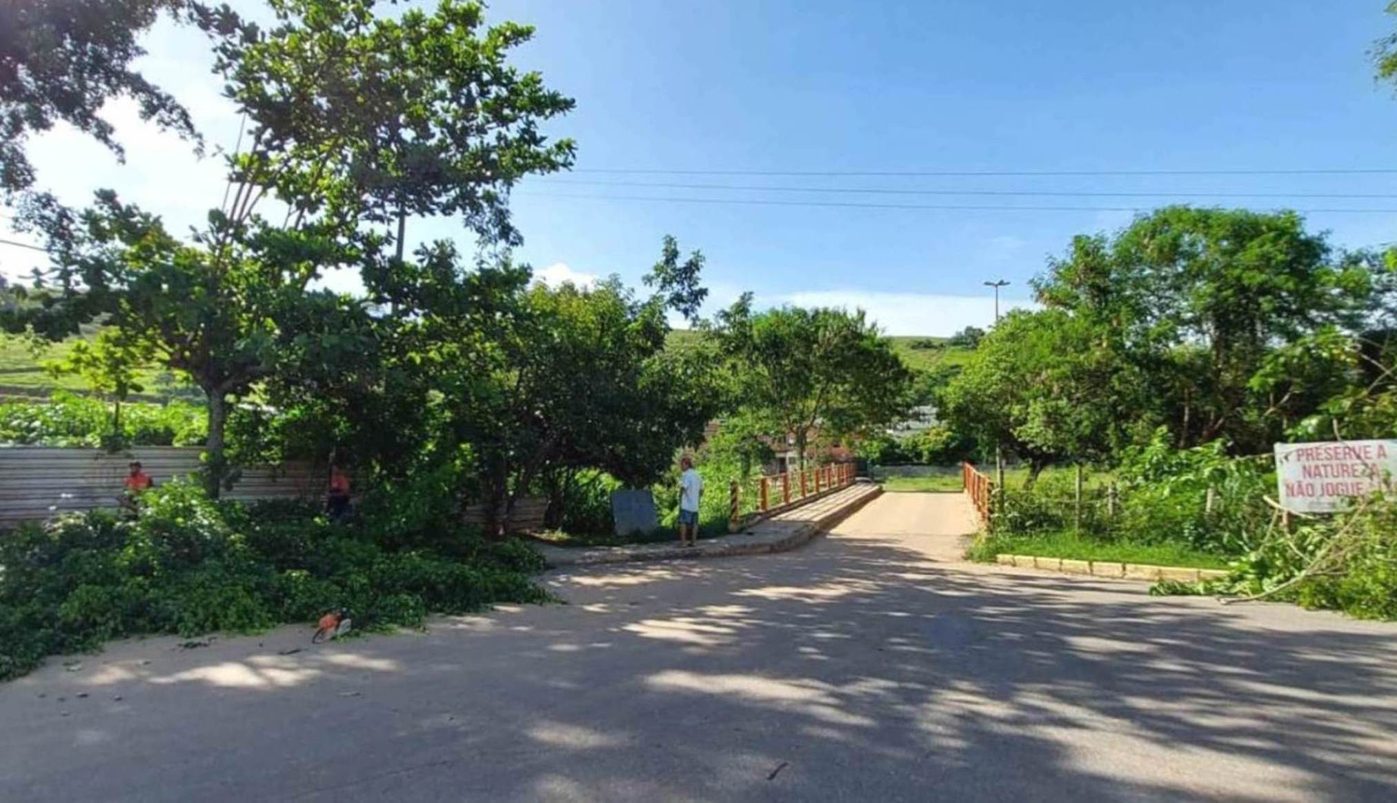 À esquerda da ponte de acesso ao bairro da Glória, integrantes da Defesa Civil de Macuco atuando na poda das espécies