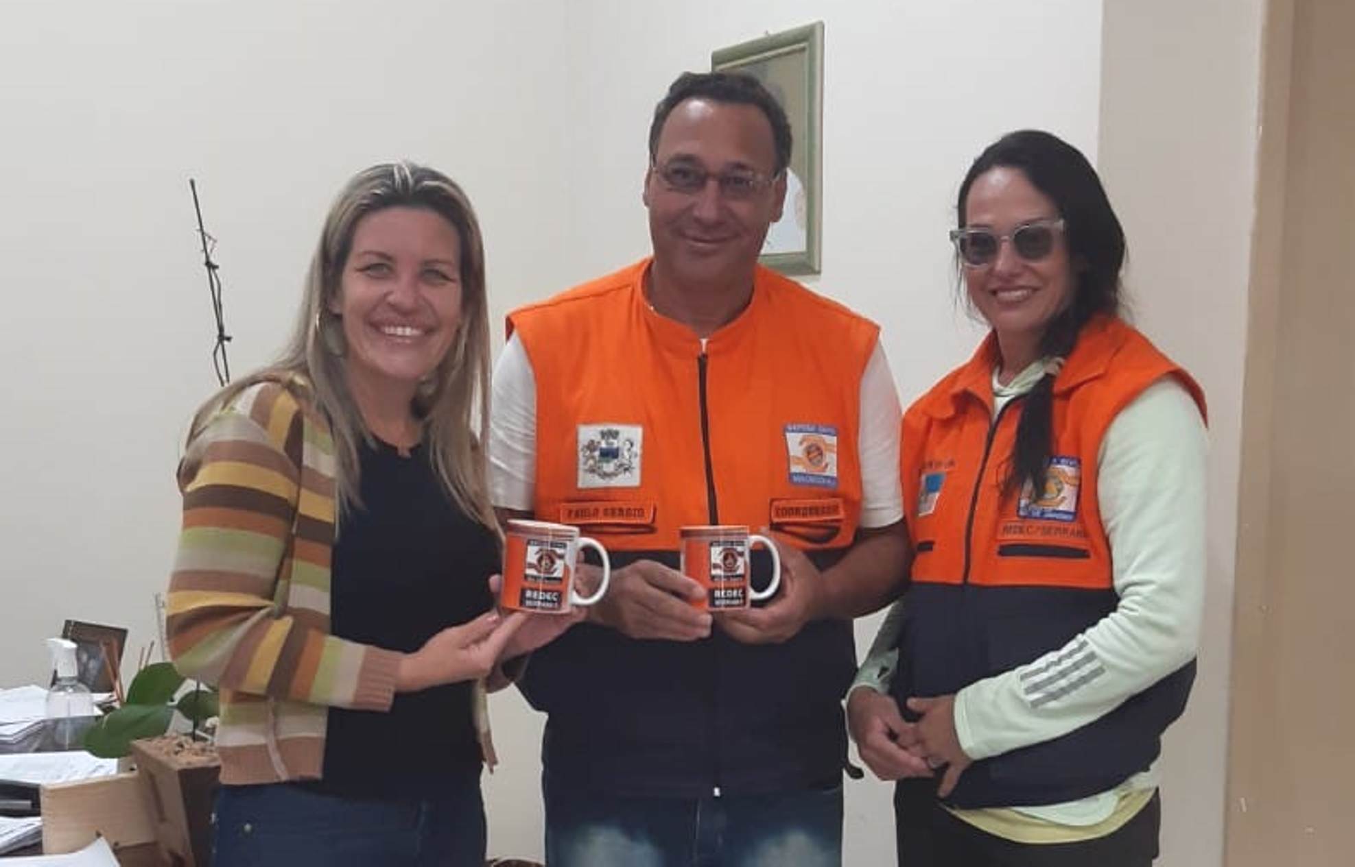 Prefeita Michelle Bianchini, coordenador de Defesa Civil de Macuco Paulo Sergio Machado e coordenadora da REDEC/Serrana Tenente Silvia Lima