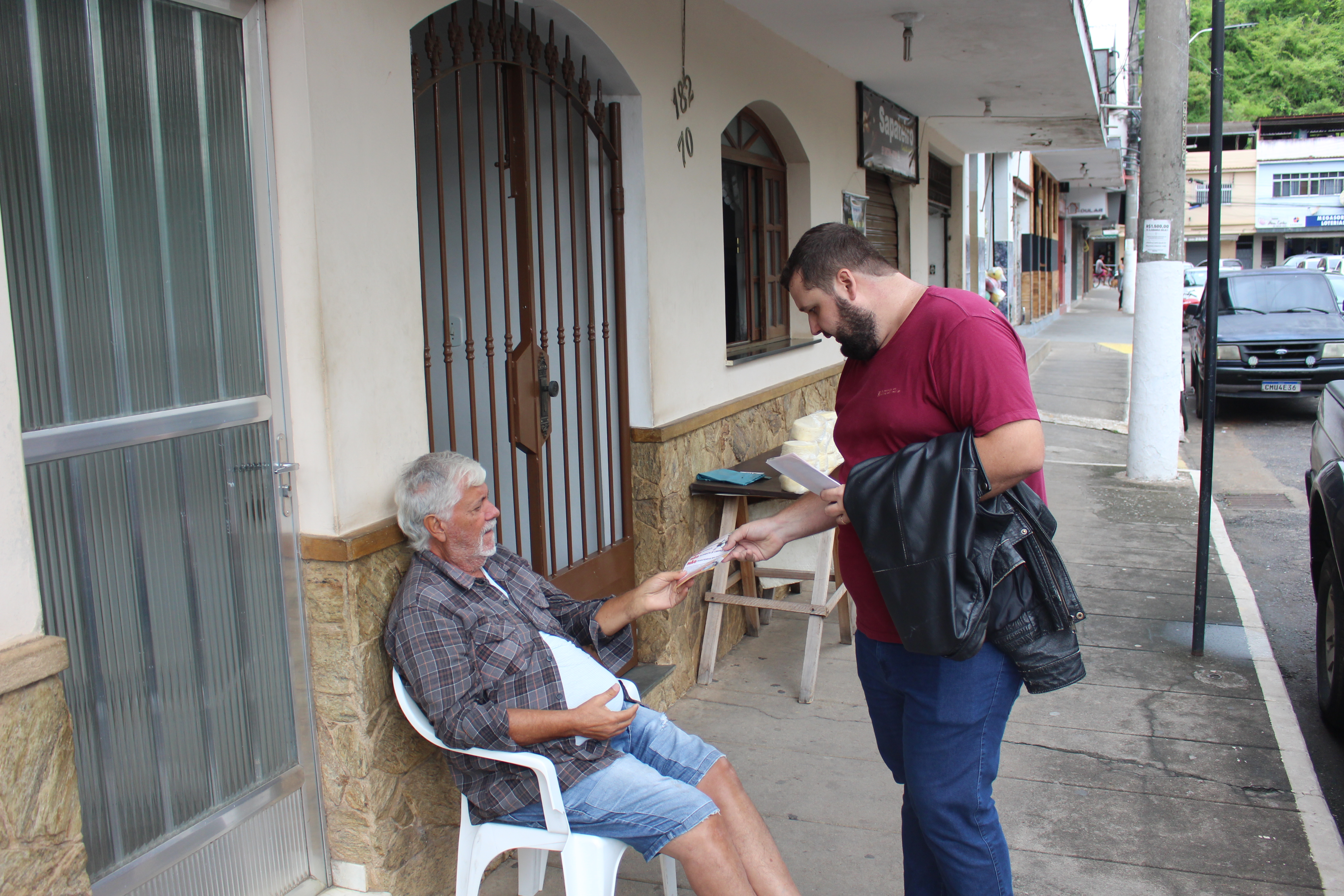 Secretário de Meio Ambiente, o ambientalista Firmo Daflon distribui panfletos e conversou com os comerciantes no centro de Macuco
