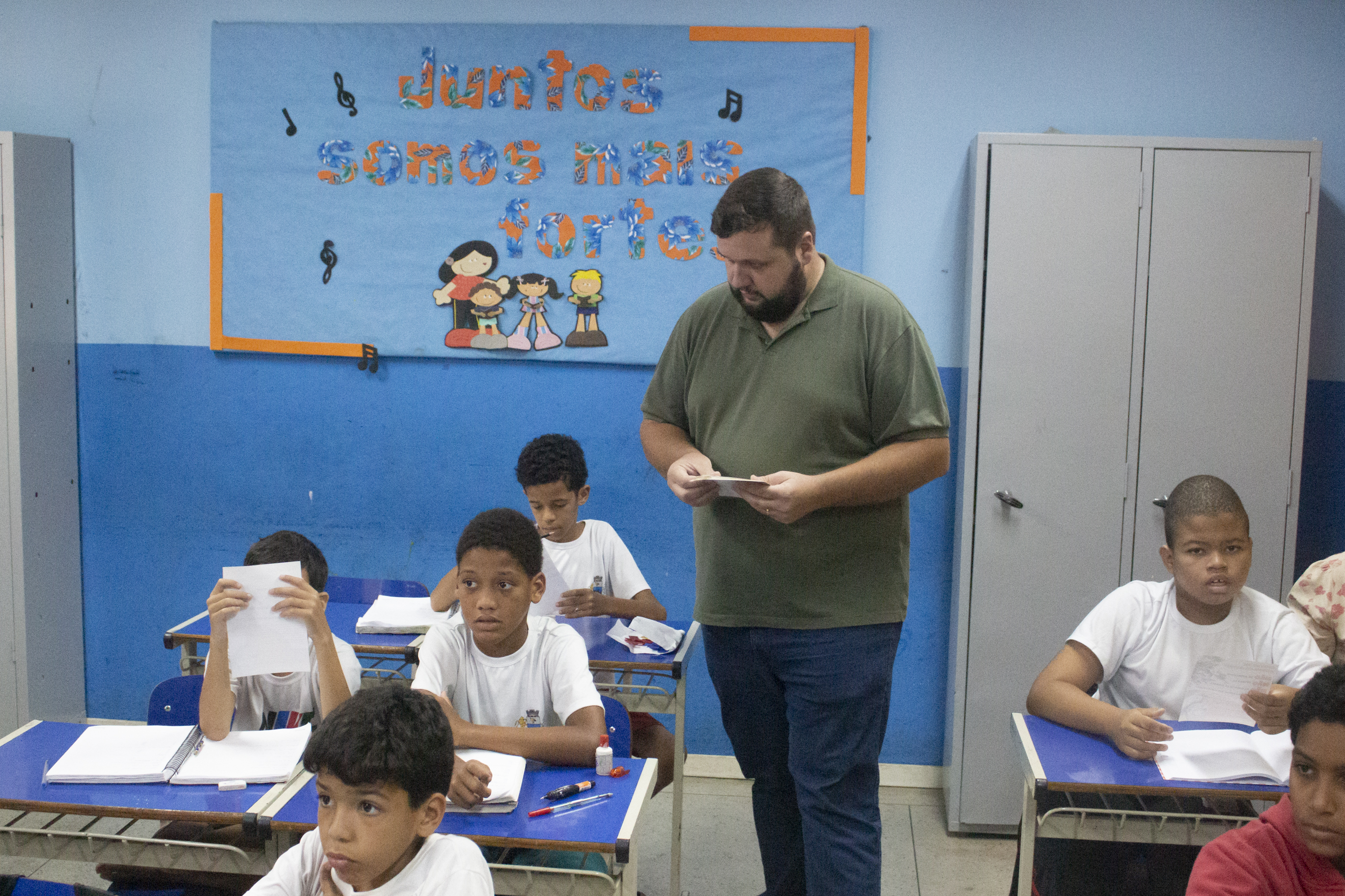 Secretário Firmo Daflon conversando com os estudantes numa das visitas feitas nas escolas municipais