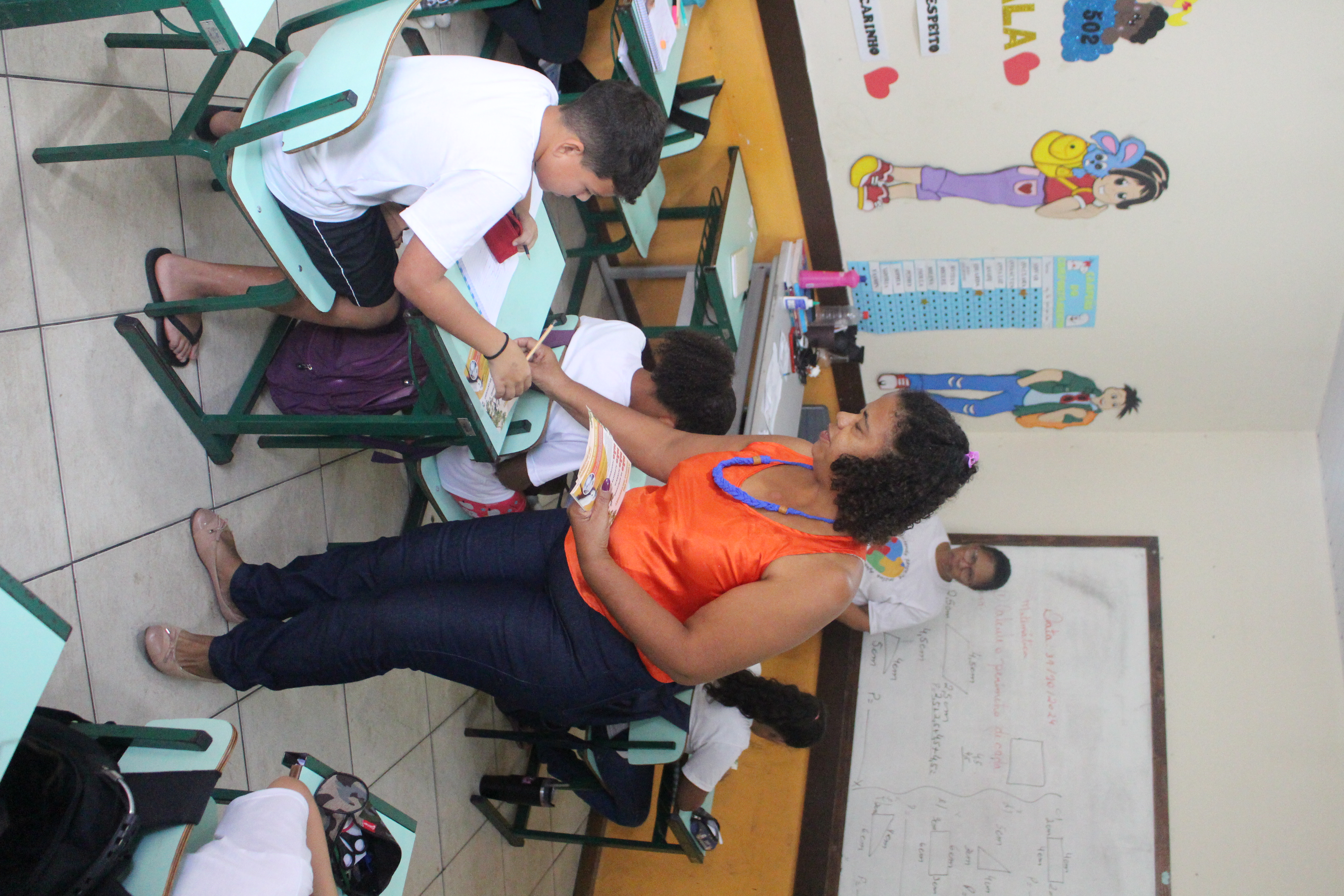 Bióloga Leila Brito conversando com a garotada numa das visitas ao CIEP Municipalizado Honório Peçanha, no bairro da Reta