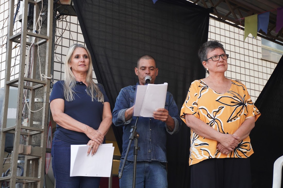 Mestre de cerimônias, Marcelo Borges, entre a secretária de Educação de Macuco, Cláudia Vogas, e a subsecretária de Educação de Cordeiro, Sidilene Feijó