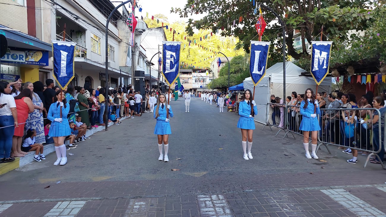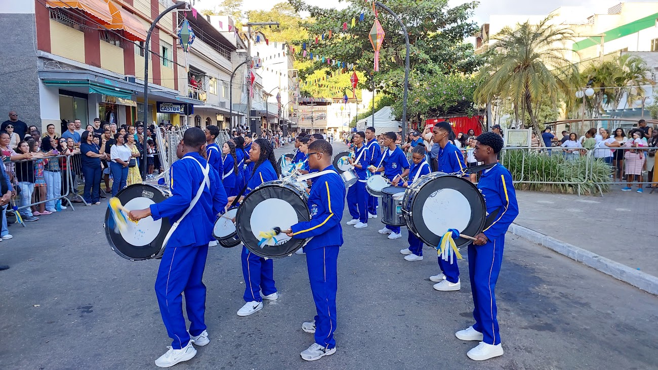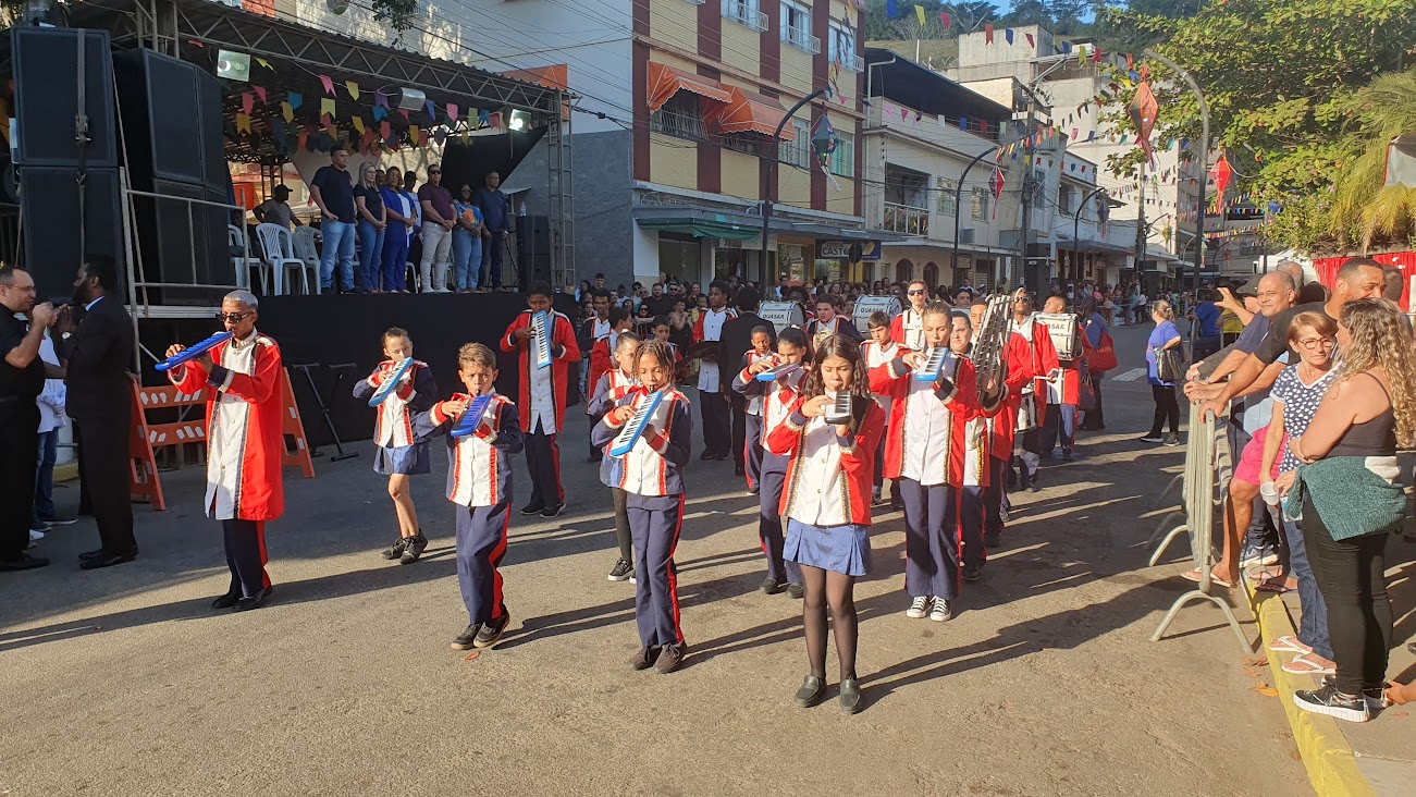 Parte integrante da programação em comemoração à semana do padroeiro macuquense, São João Batista, a passagem das instituições pela passarela teve início com a Guarda Mirim Municipal. Na sequência, vieram as bandas marciais do CIEP/511 de Monnerat, em Duas Barras, Escola Zuleika Judice de Matos Rodrigues, de Cordeiro, e ainda a Banda de Tambores do Colégio Canadá, atração de Nova Friburgo, convidadas de honra que abrilhantaram o atrativo desfile. Não poderiam faltar as bandas Juliano Lopes de Souza, CEFRA, IELM e José Carlos Boaretto. Em meio às apresentações, o pároco Fernando Pacheco, da Paróquia de São João Batista, falou sobre os festejos, orou pelos estudantes e mestres e abençoou o público presente.