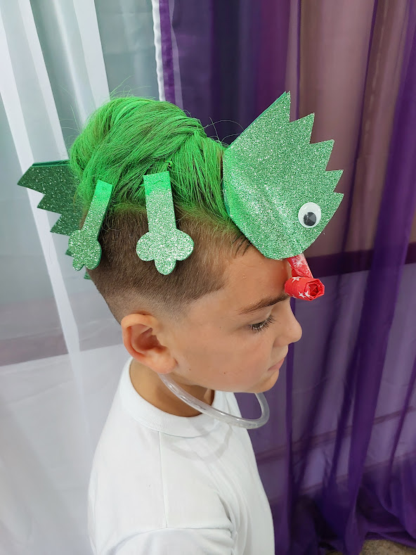 O cabelo desse garotão ficou bem legal ao simular uma iguana repousando sobre sua cabeça