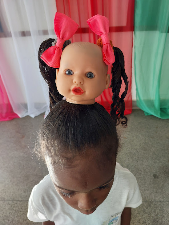 Essa pequena estudante exibiu uma bela boneca aproveitando detalhes do próprio penteado