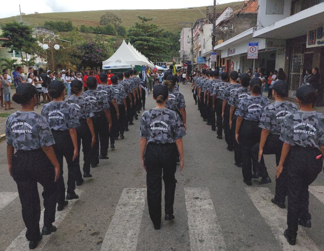Imagem bonita dos jovens da Guarda Mirim Ambiental desfilando durante a tarde na Festa Literária de Macuco