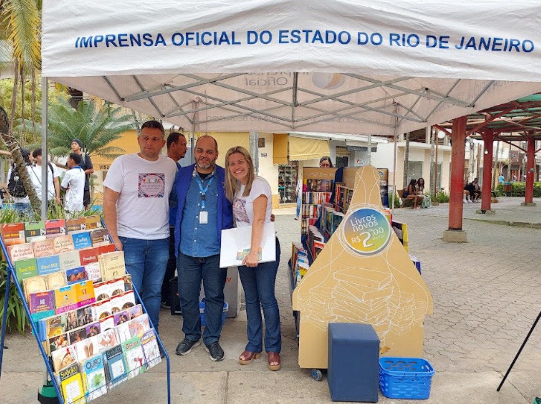 Secretário de Governo e Gestão e prefeita de Macuco prestigiando o estande de livros da Imprensa Oficial do Estado do Rio de Janeiro