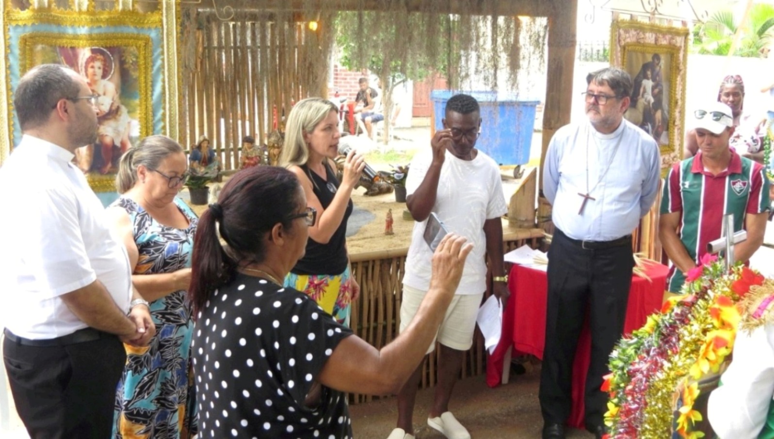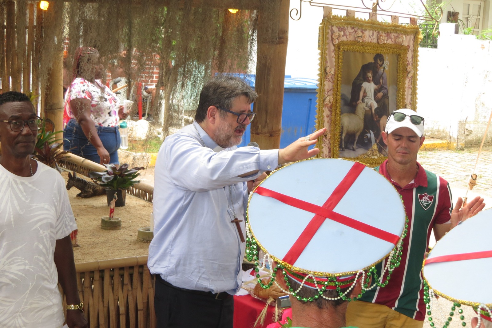 Momento em que o bispo Dom Luiz Antônio Ricci estendeu a mão orando e abençoando os festejos e seus participantes em Macuco