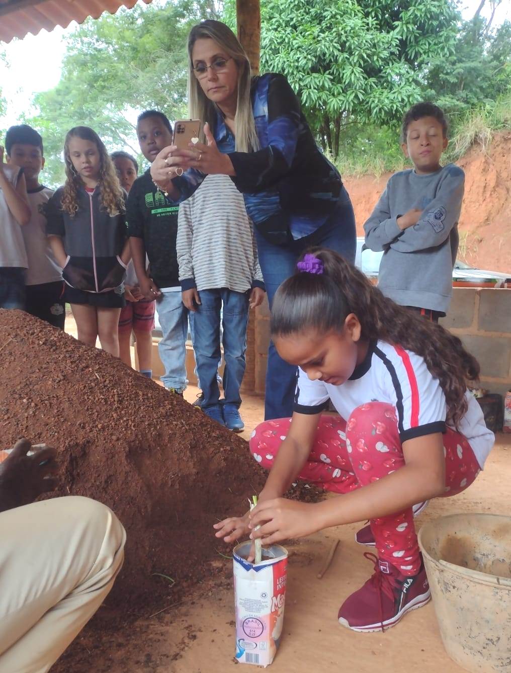 Secretária de Educação Claudia Vogas registra em seu celular a aluna realizando o trabalho de assentamento da muda