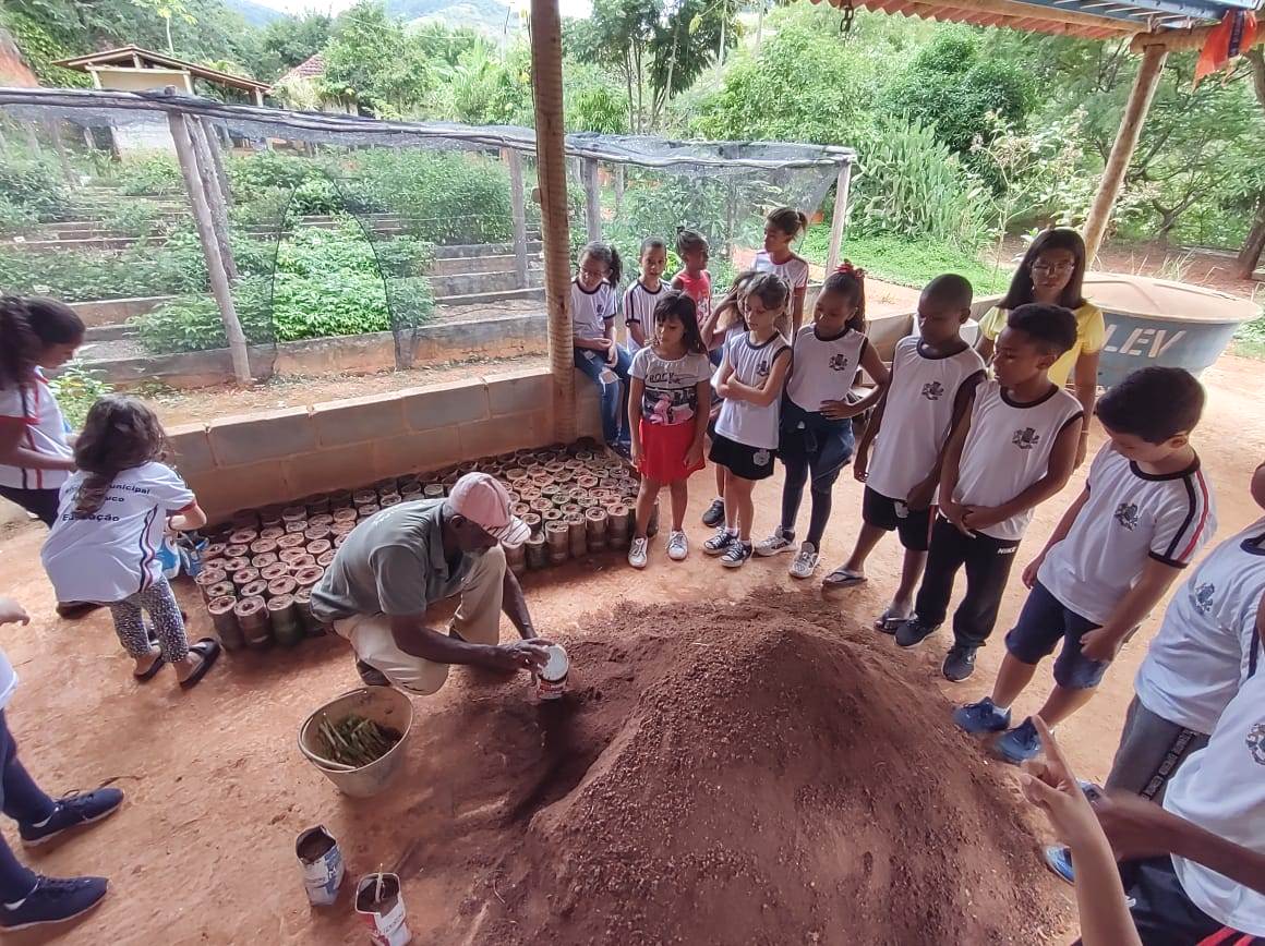 Interagindo bem com os pequenos estudantes, André Jardim explica detalhes dos canteiros onde as mudas são produzidas