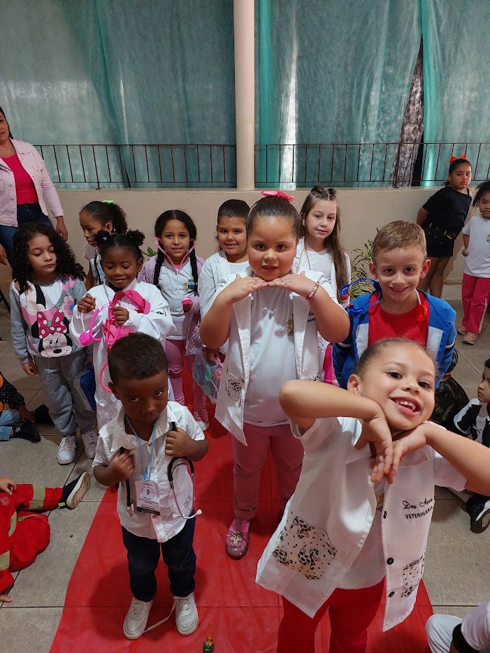 Singeleza e fofura com os alunos se vestindo à caráter para relembrar os profissionais de saúde