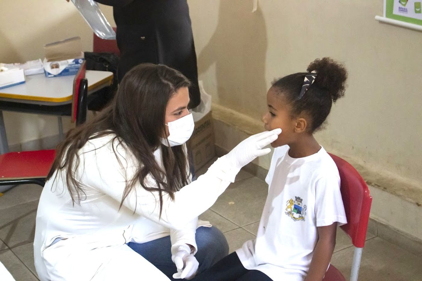 Mais um pequeno aluno tendo seus dentes examinados pela doutora Shirle Campos, dando sequência ao projeto de parceria entre Saúde e Educação