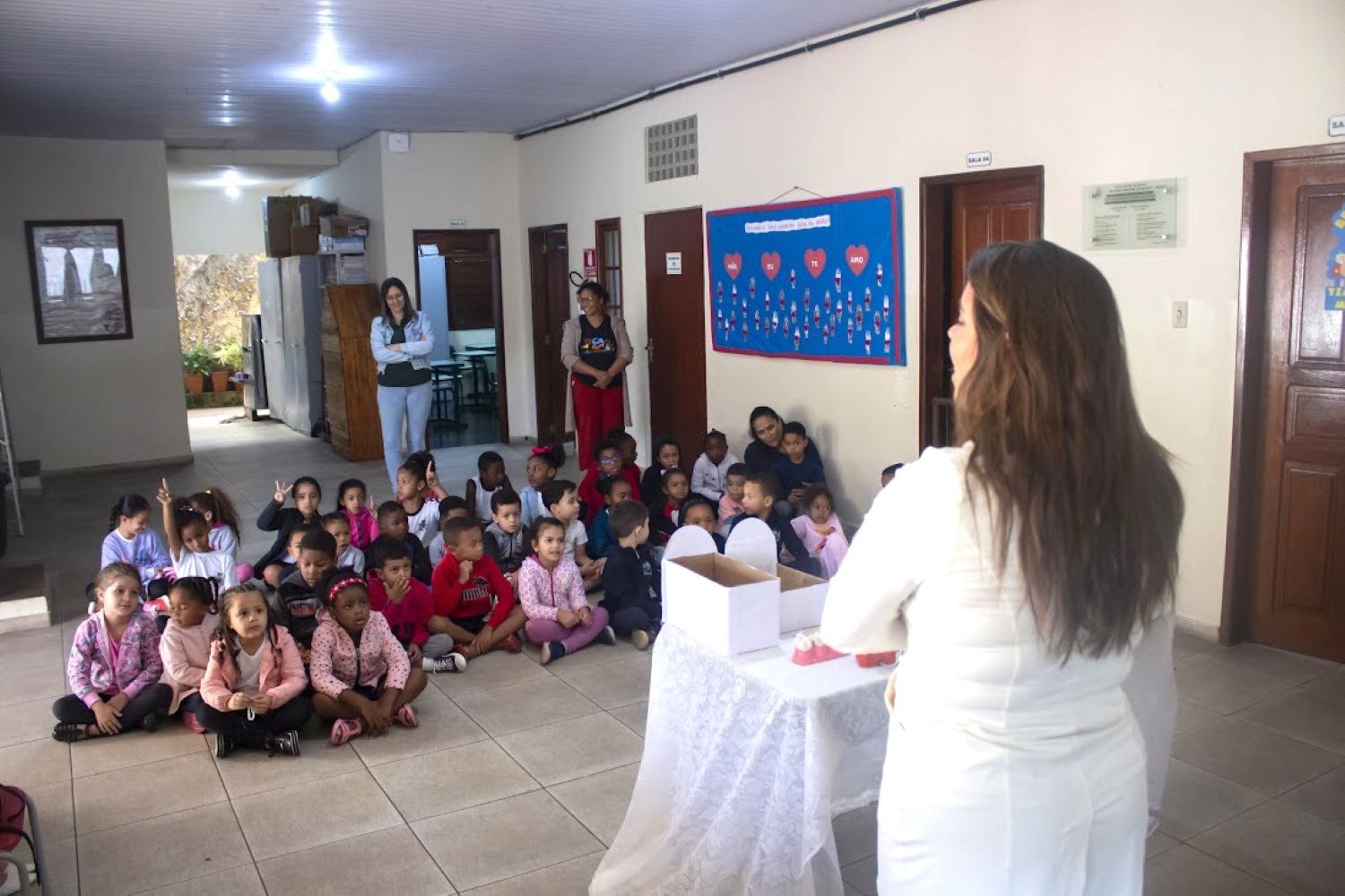 Alunos ficaram atentos às explicações da doutora Irys durante a apresentação do projeto de saúde bucal na escola