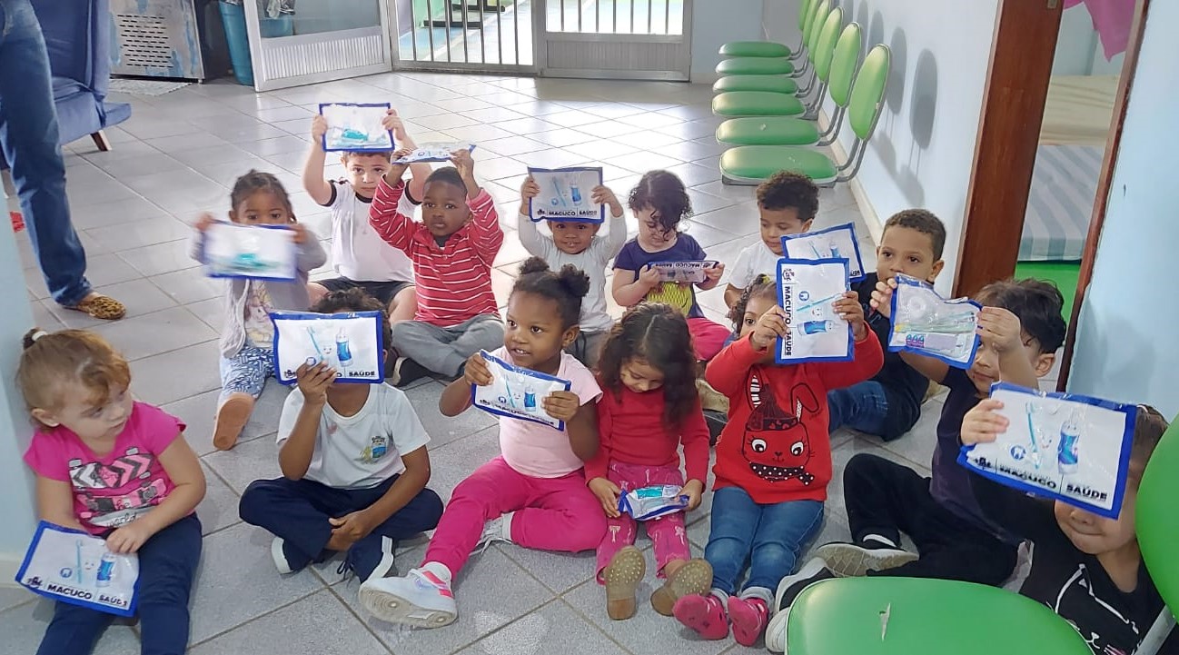 Estudantes de uma das escolas exibem o kit recebido da Coordenação de Odontologia da Secretaria de Saúde de Macuco