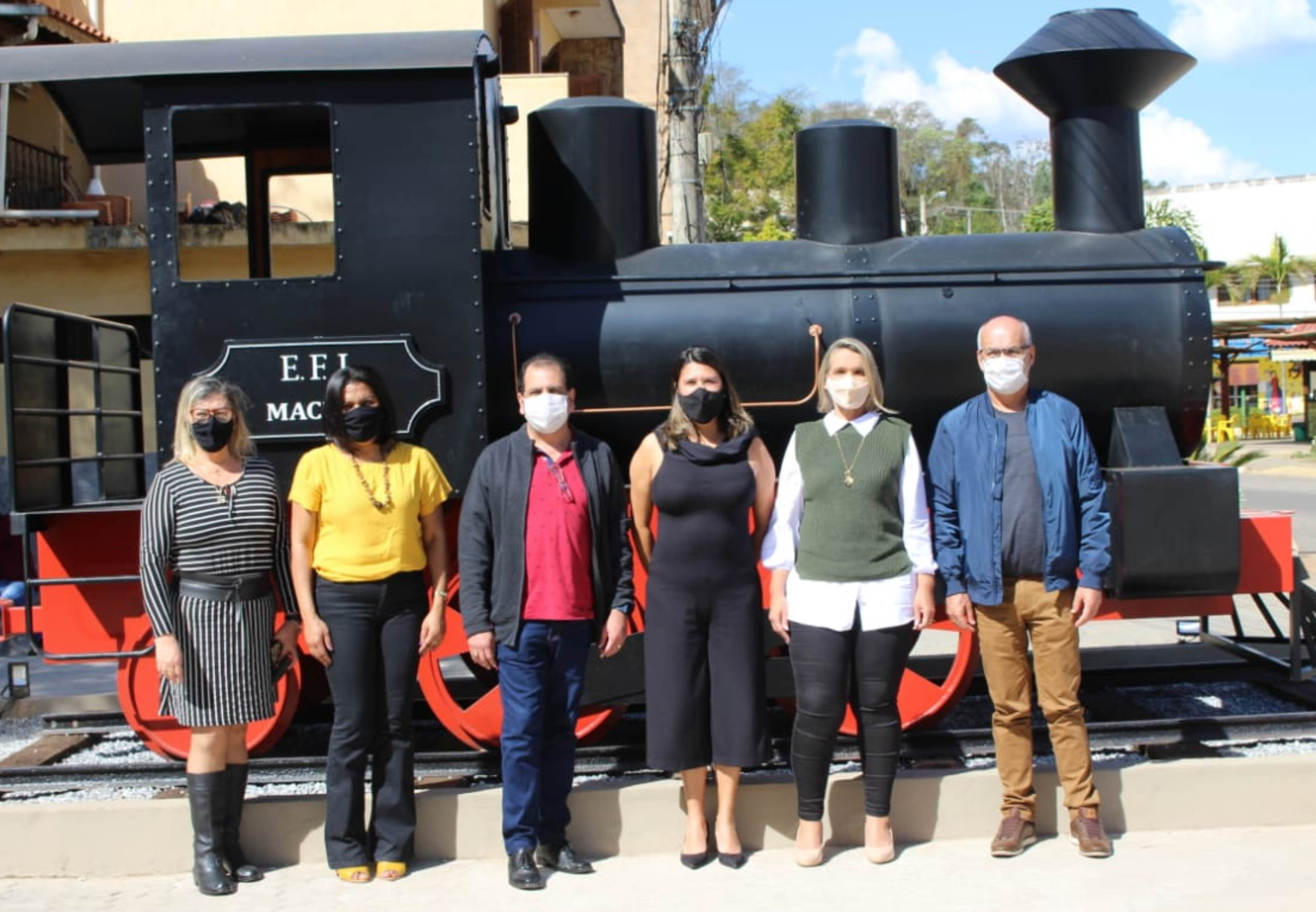 Secretários participantes em fotografia diante da réplica da Maria Fumaça