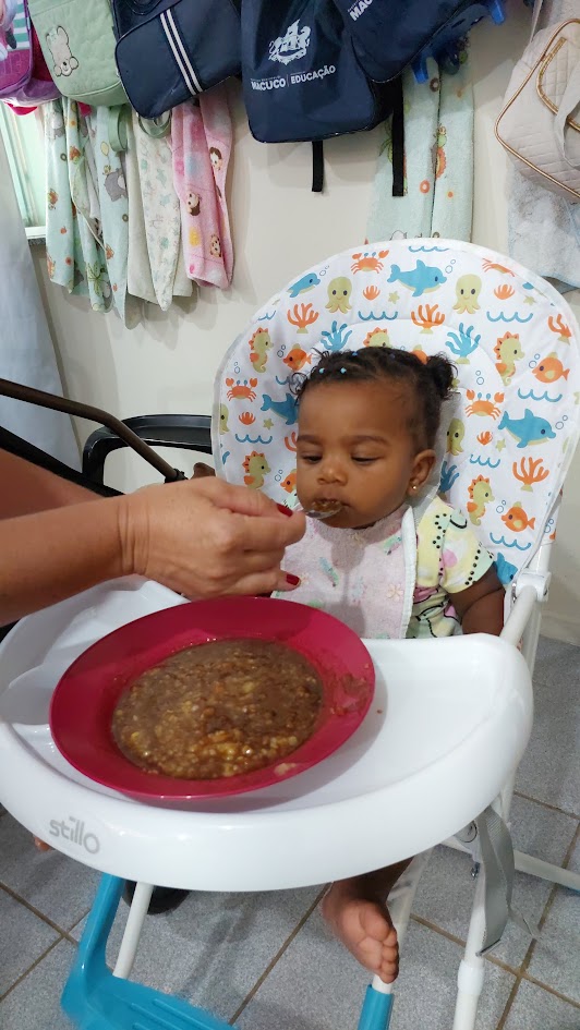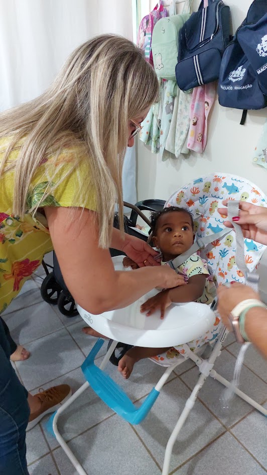 Já devidamente colocada na cadeirinha de refeição, a pequena aluna desfruta de sua comidinha com tranquilidade e segurança